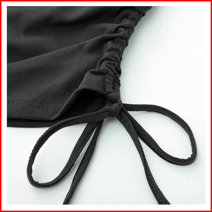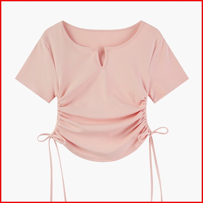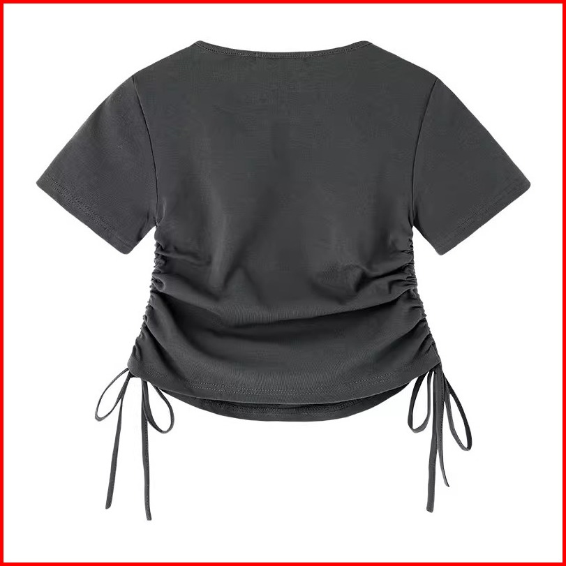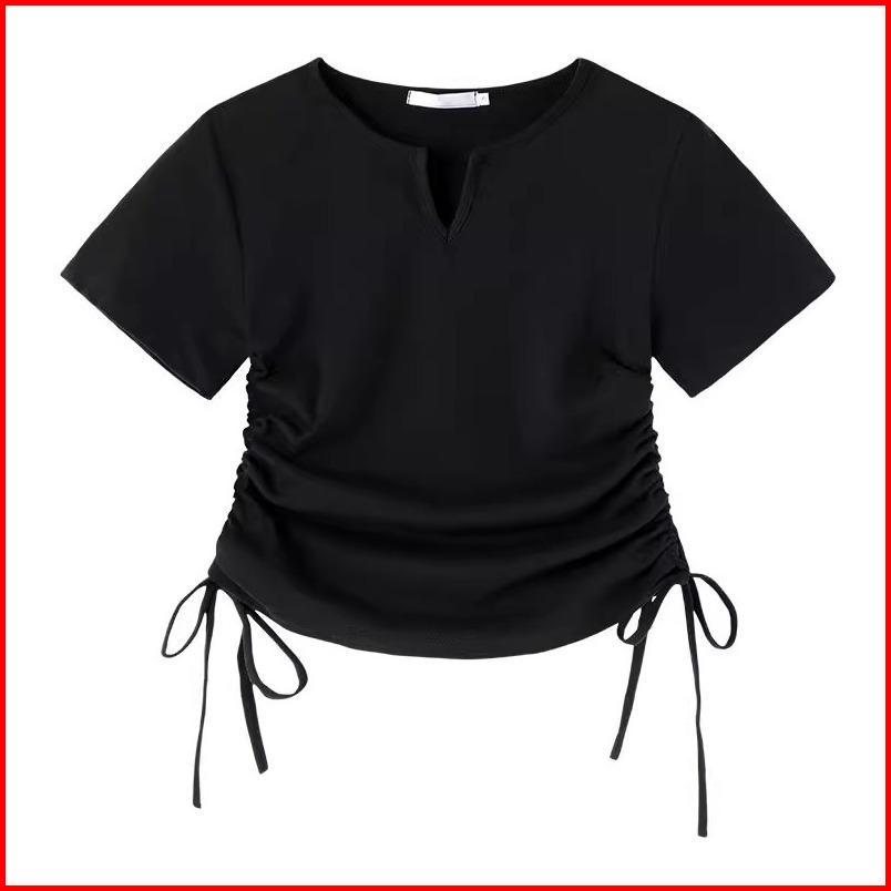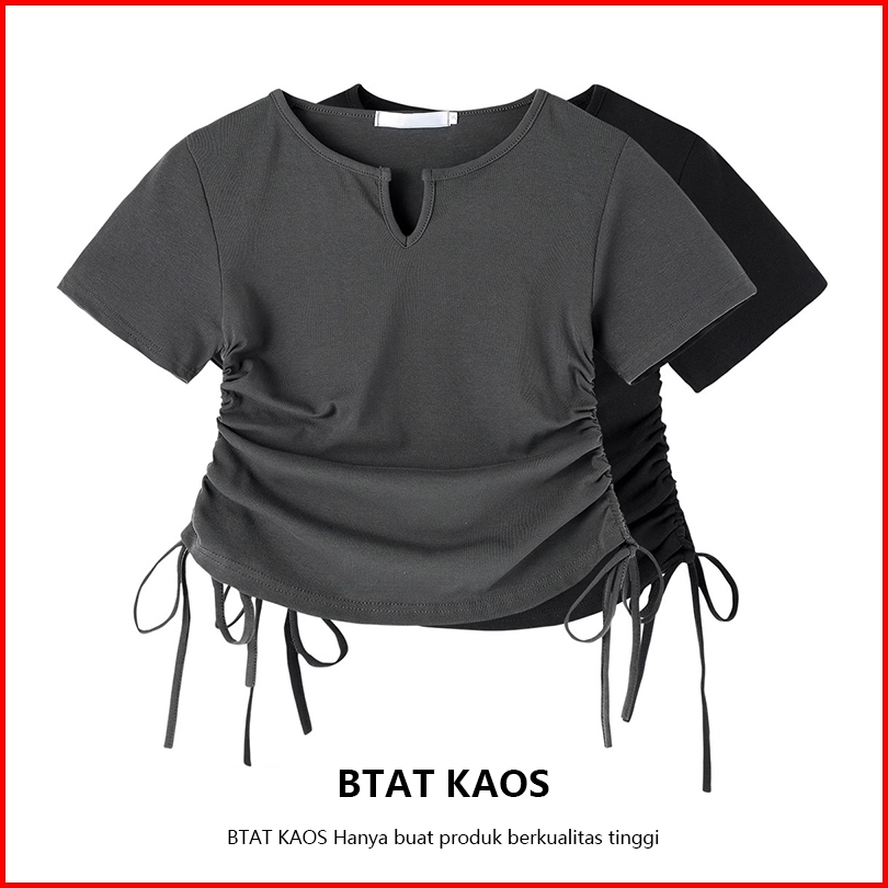Premium Leher V Neck Short Sleeve Ruched Drawstring Crop Top Kaos Warna Putih