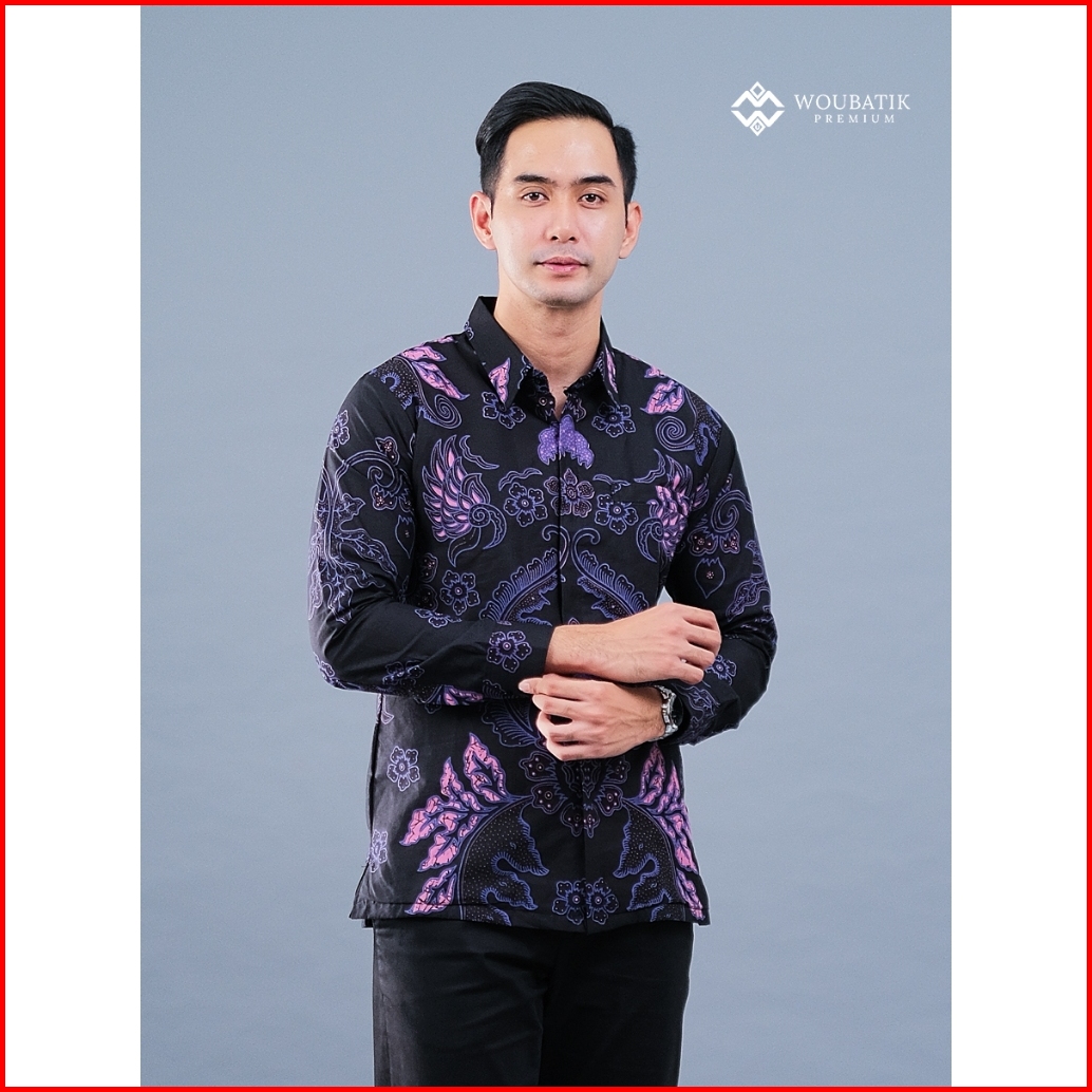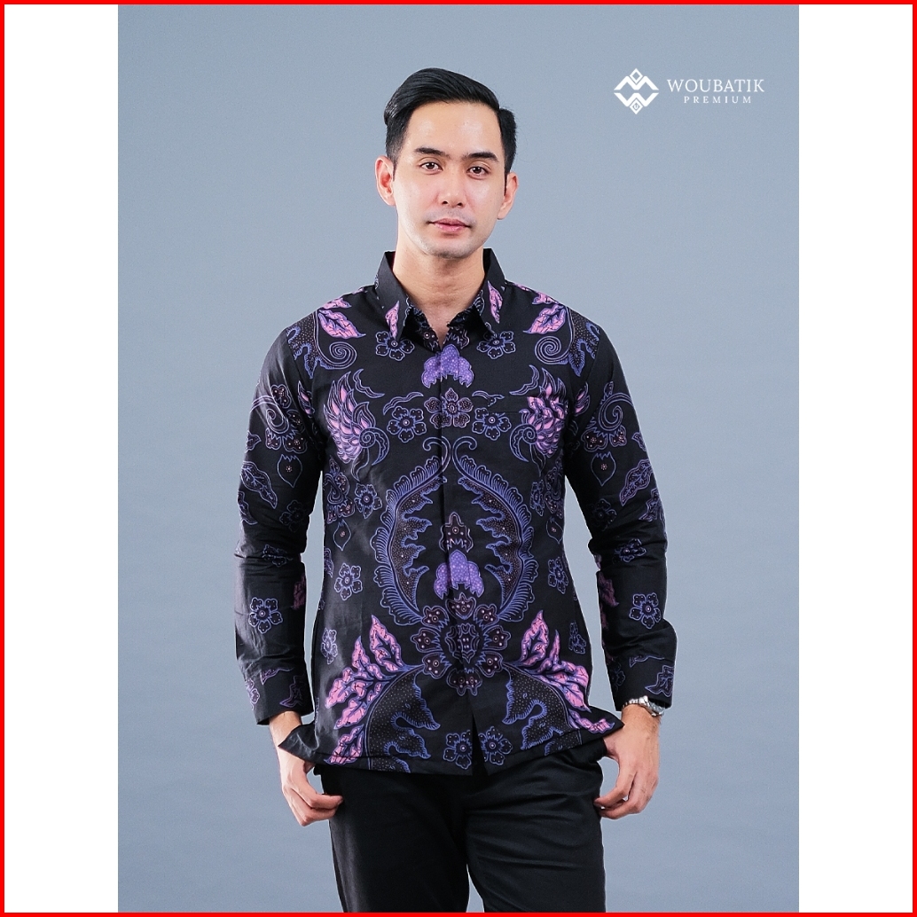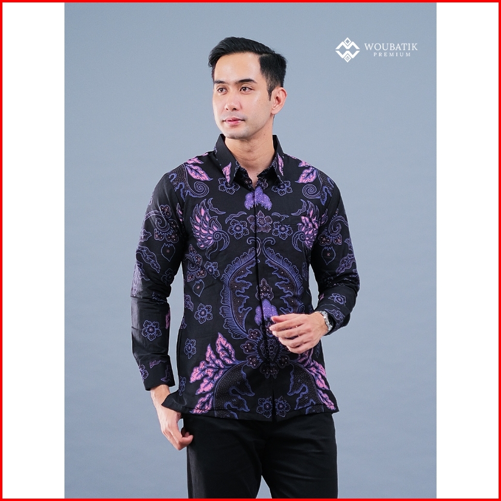 Woubatik - Kemeja Batik Pria Furing Lengan Panjang Slimfit Warna Hitam Motif Dusty Pink Modern Premium Kp 314