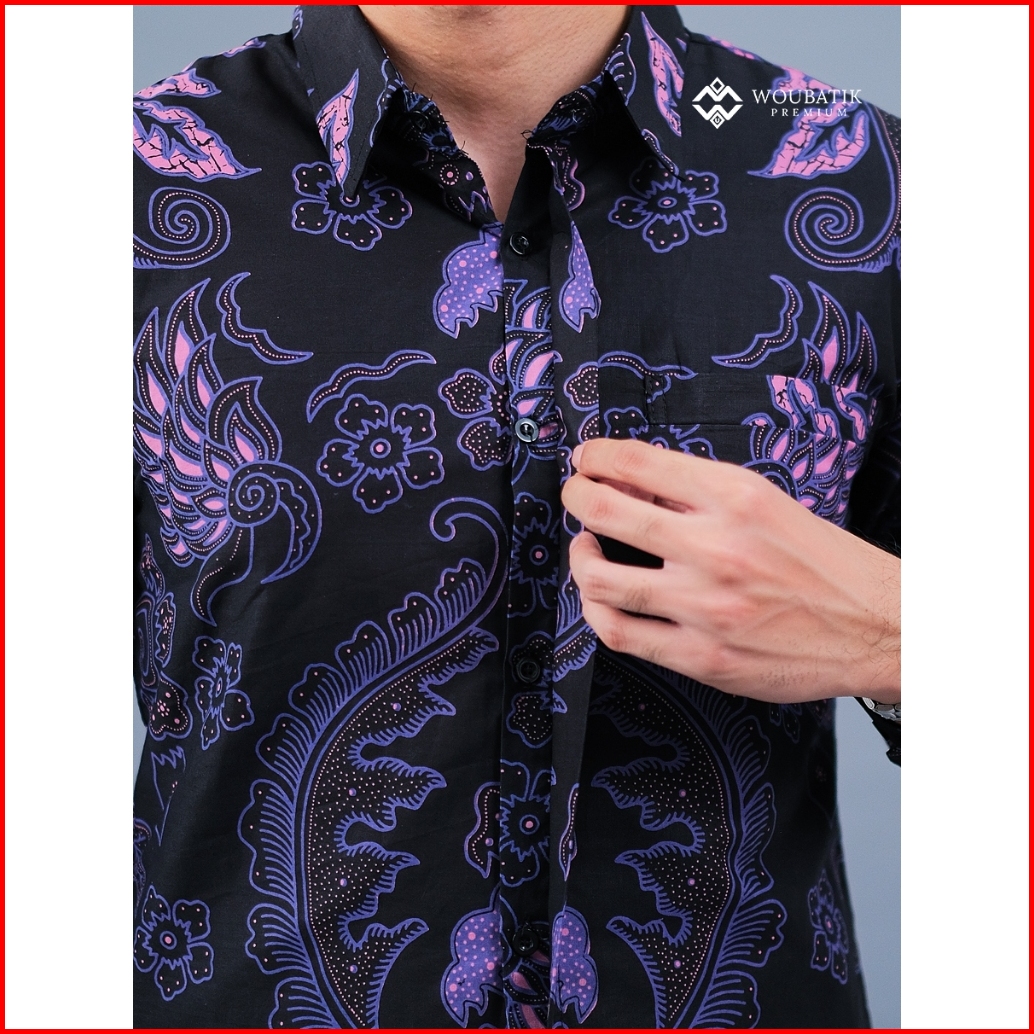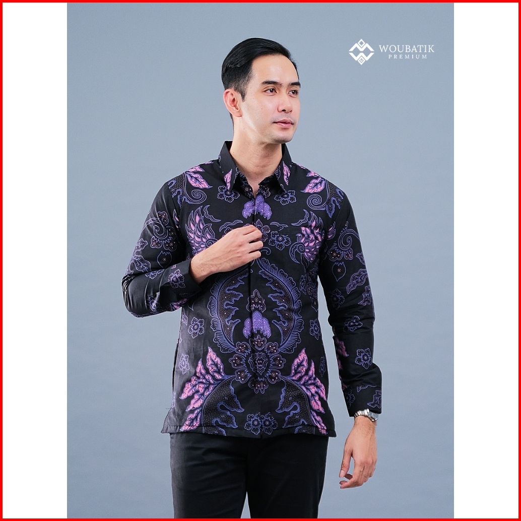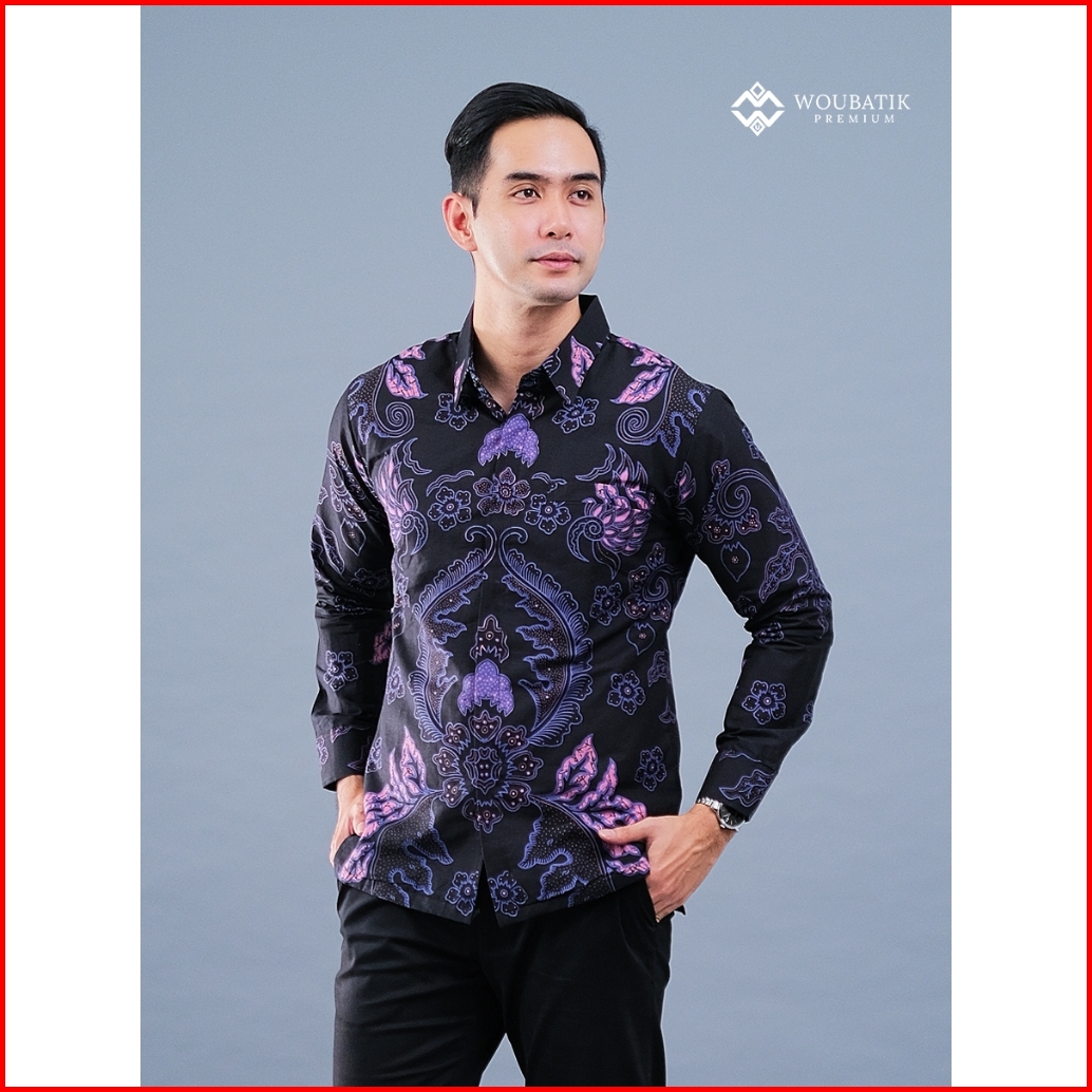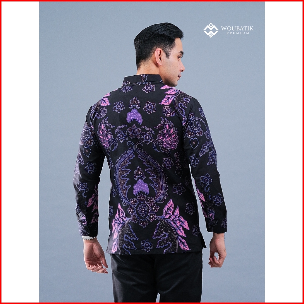 Woubatik - Kemeja Batik Pria Furing Lengan Panjang Slimfit Warna Hitam Motif Dusty Pink Modern Premium Kp 314