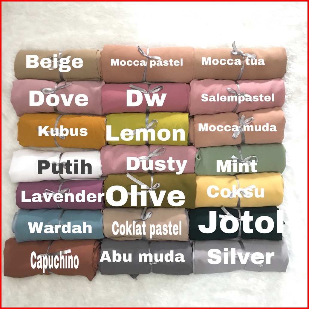 Abu Tua, Brown, Coffee, Cream, Denim, Dusty Pink, Honey Cream, Lilac, Maroon, Milo, Mustard, Navy, Nude, Pink Nude, Rose, Taro, Turkish, Wardah, Hijau Tua, Coksu, GreenTea, Hijau Botol, Lavender, Oat, Salem, Biru Muda, Mocca