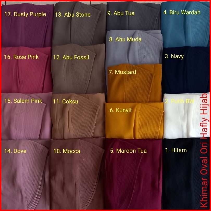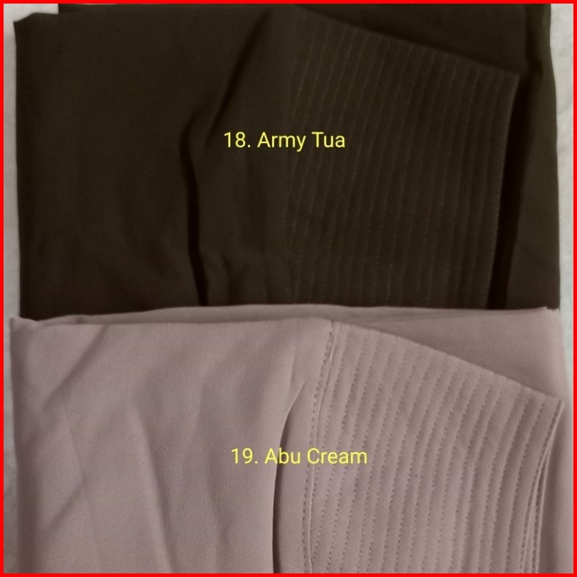 1. HITAM, 2. PUTIH BW, 3. NAVY, 4. BIRU WARDAH, 5. MAROON TUA, 6. KUNYIT, 7. MUSTARD, 8. ABU MUDA, 9. ABU TUA, 10. MOCCA, 11. COKSU, 12. ABU FOSSIL, 13. ABU STONE, 14. DOVE, 15. SALEM PINK, 16. ROSE PINK, 17. DUSTY PURPLE, 18. ARMY TUA, 19. ABU CREAM