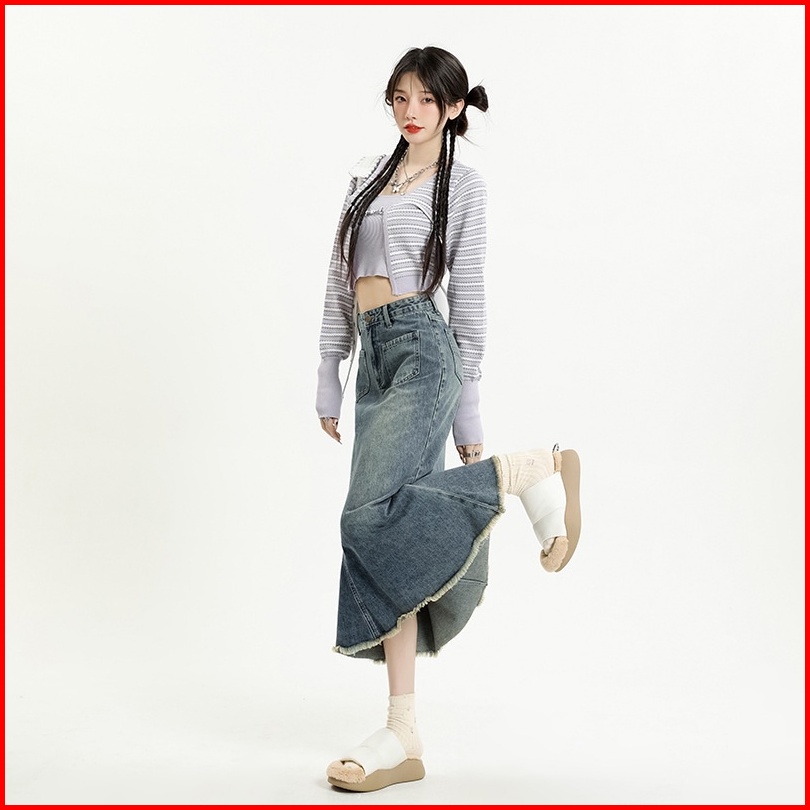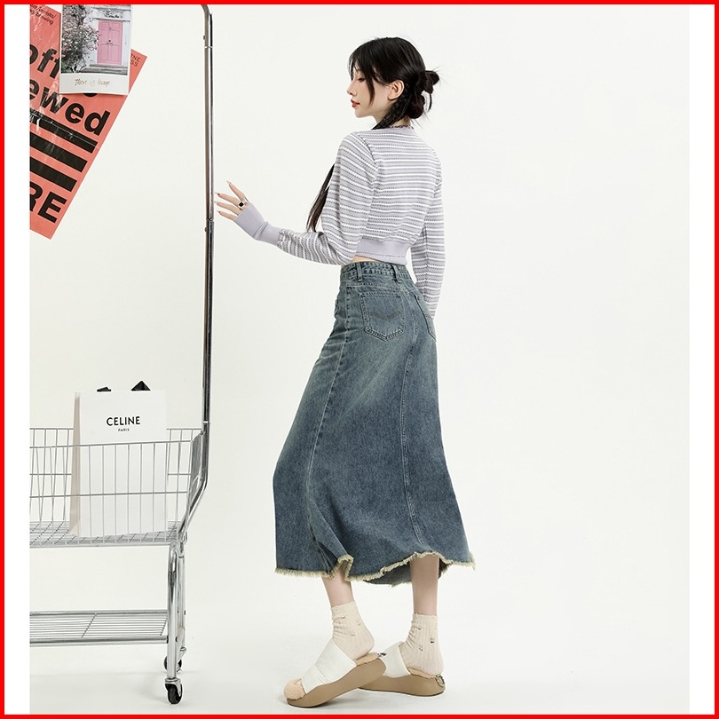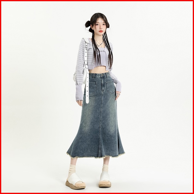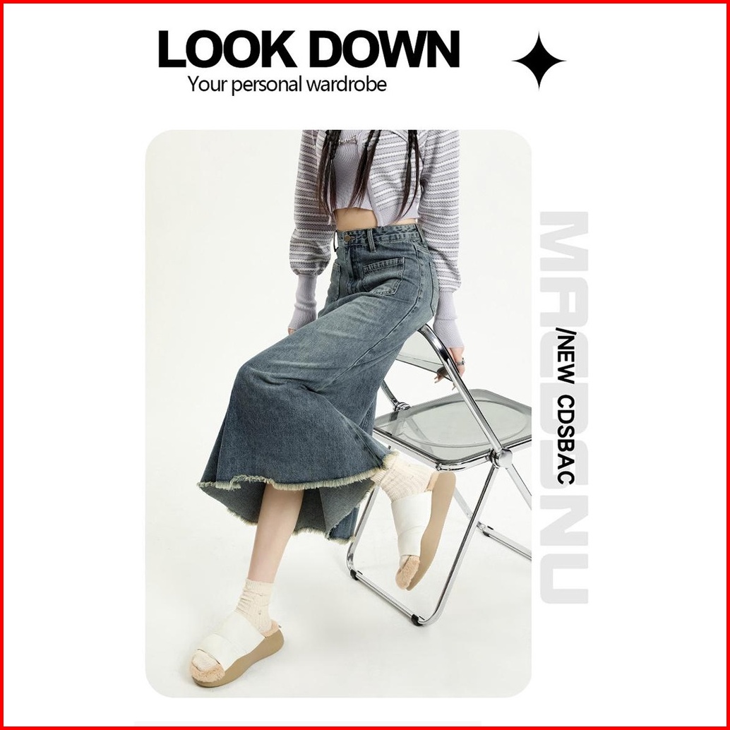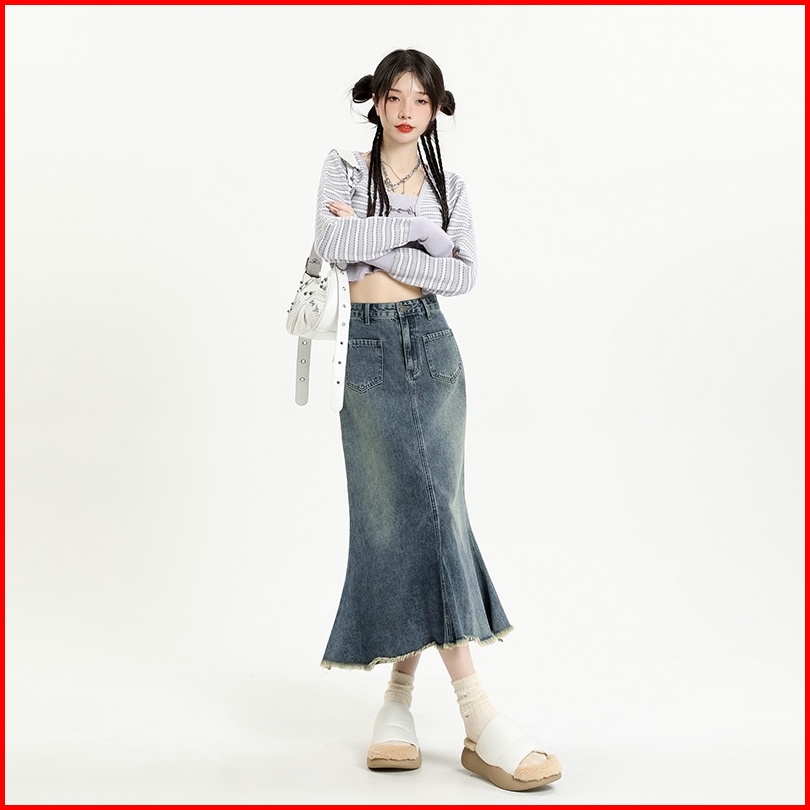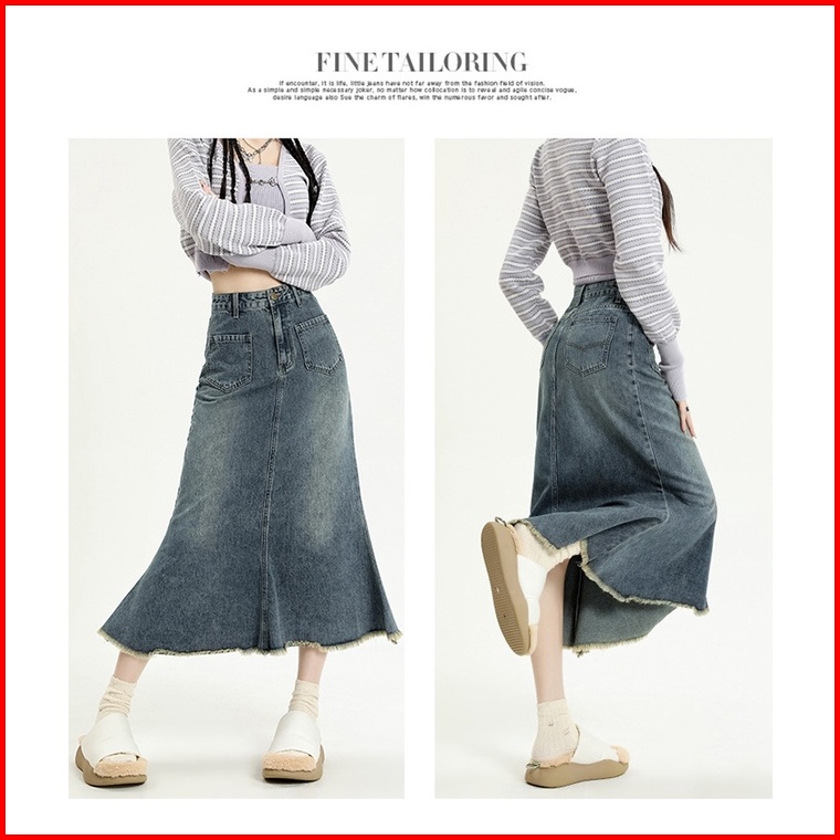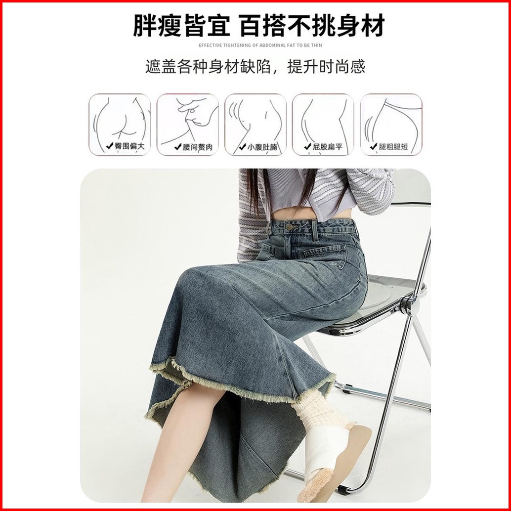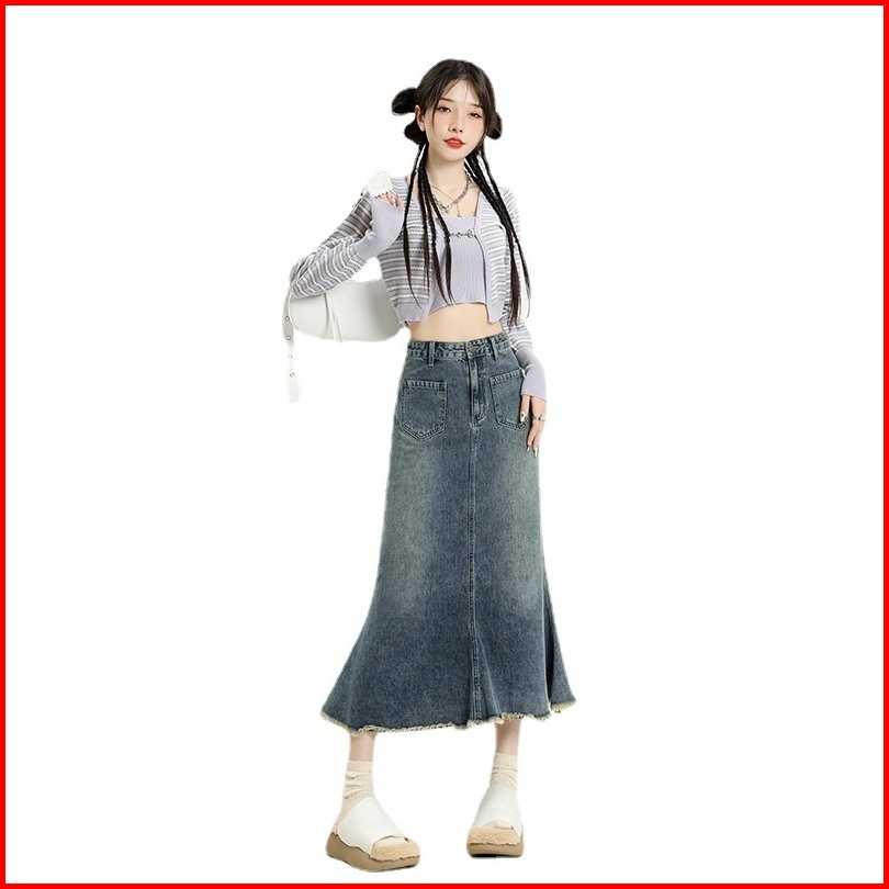 Re022 Musim Panas Wanita Baru Pinggang Tinggi Tepi Mentah Rok Putri Duyung Rok Denim Panjang Longgar Dan Tipis All-match