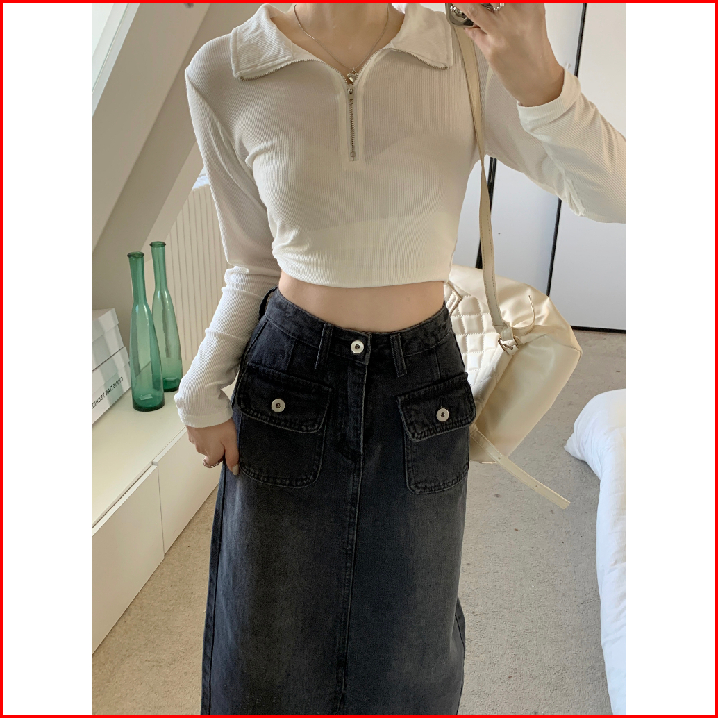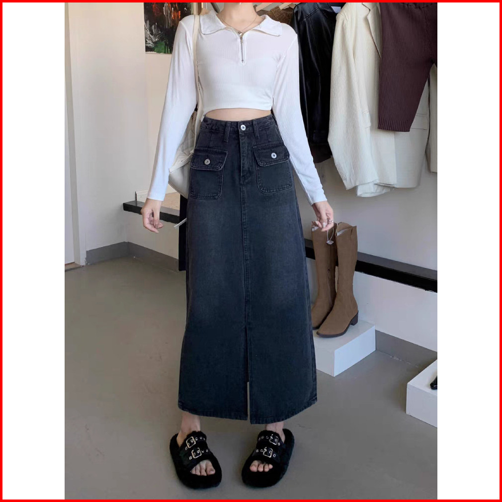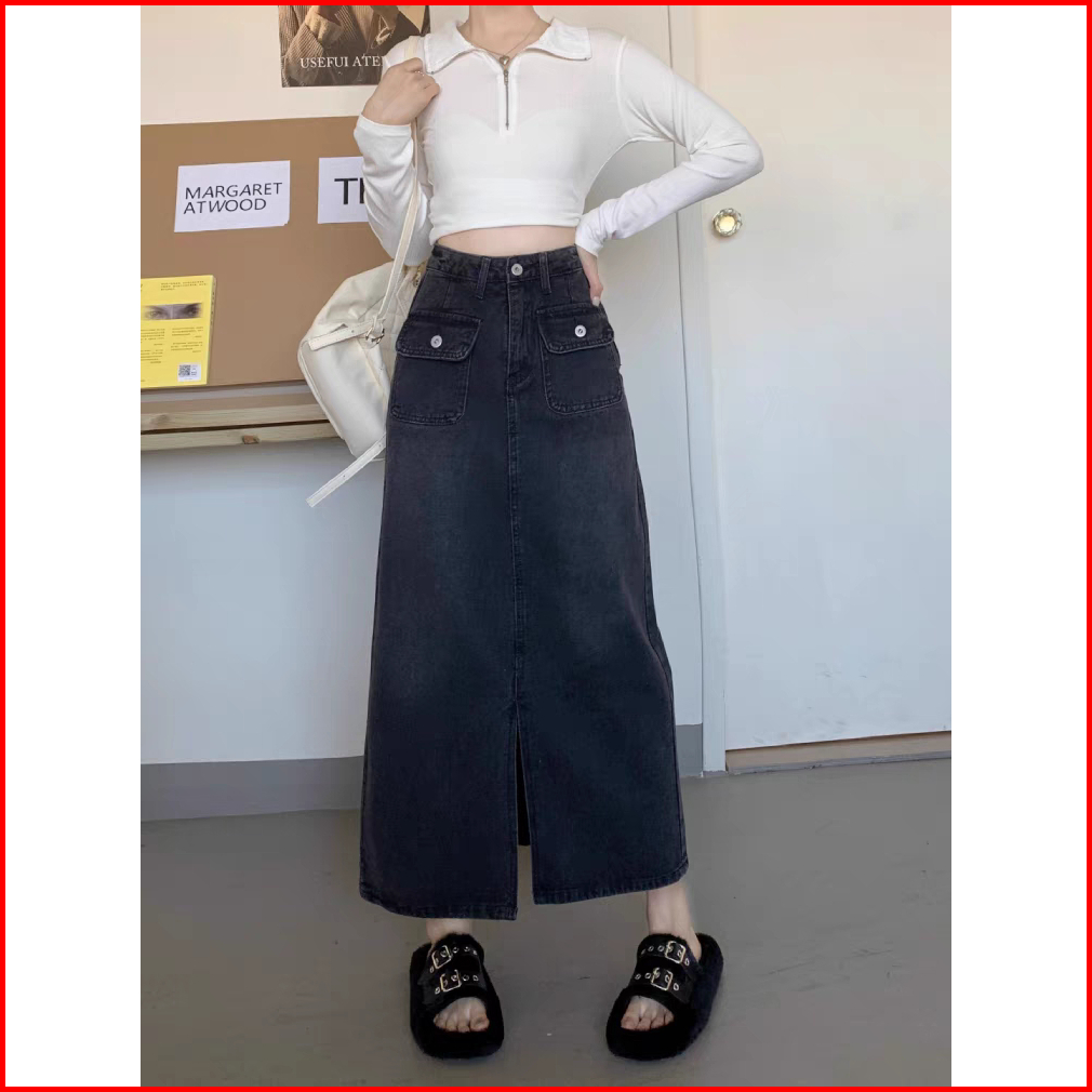 Button Pocket Rok Denim Panjang Wanita Korean Style Slit A-line Skirt Midi