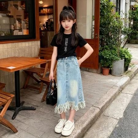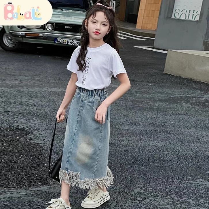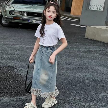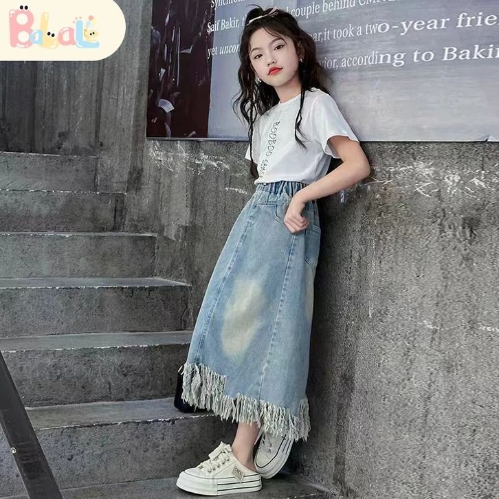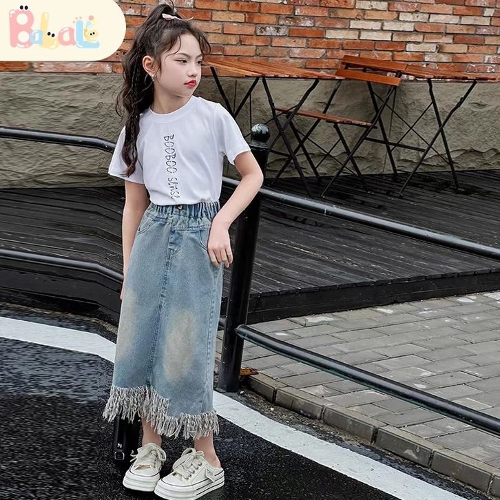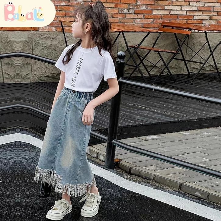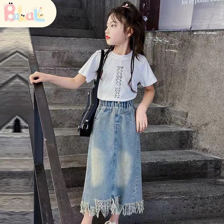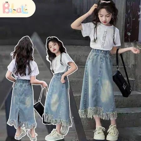 Rok Jeans Anak Setelan Rok Cargo Anak Perempuan Impor Oneset Anak Cewek Atasan Lengan Pendek+Rok Denim
