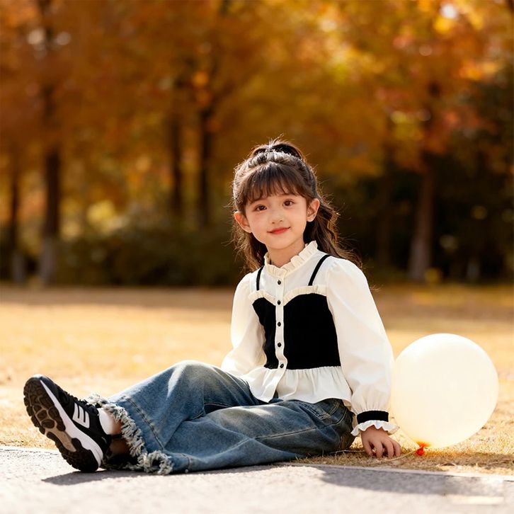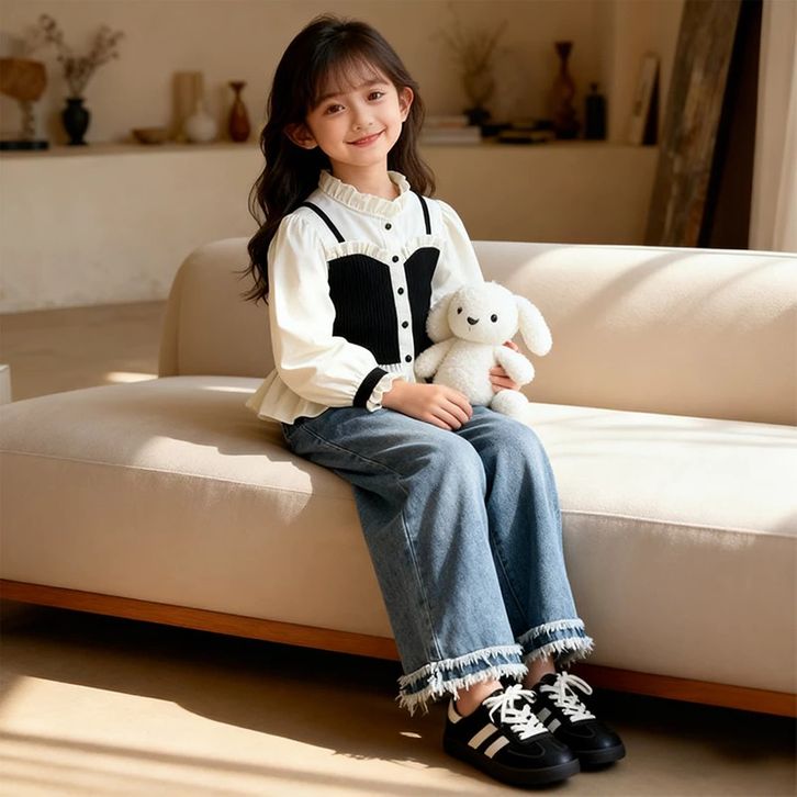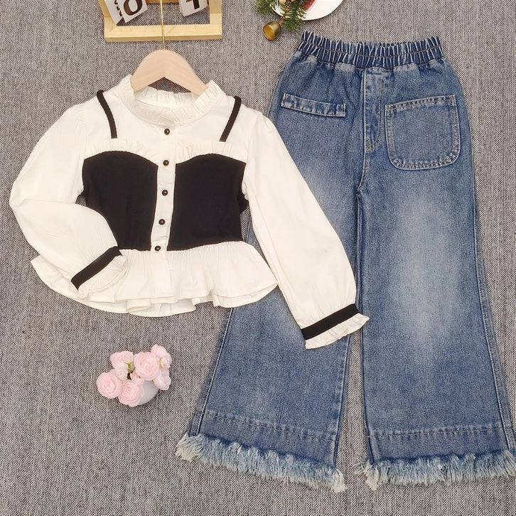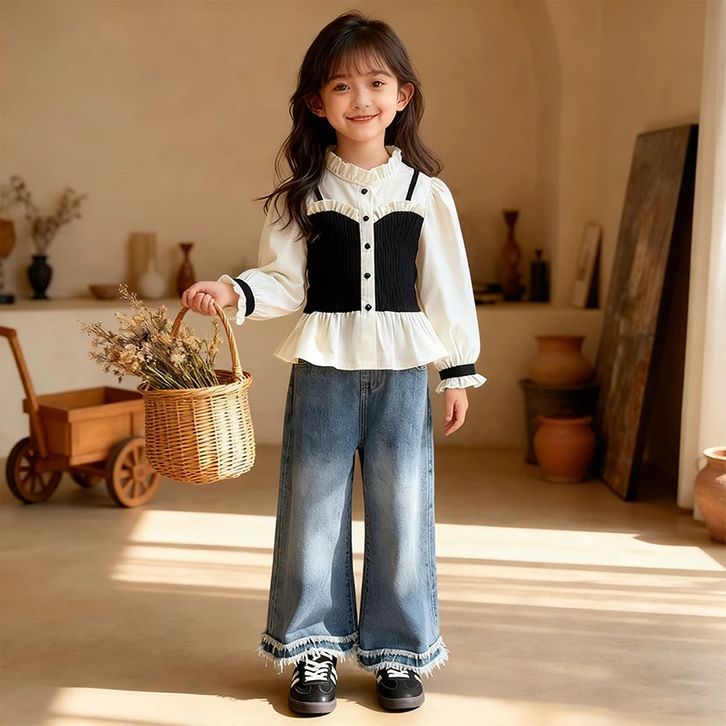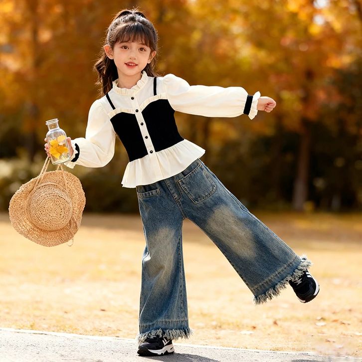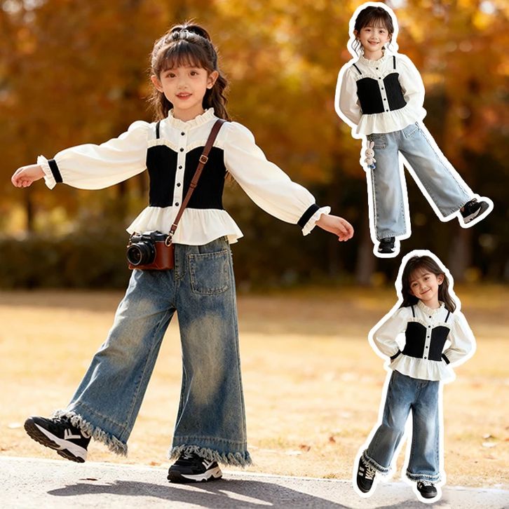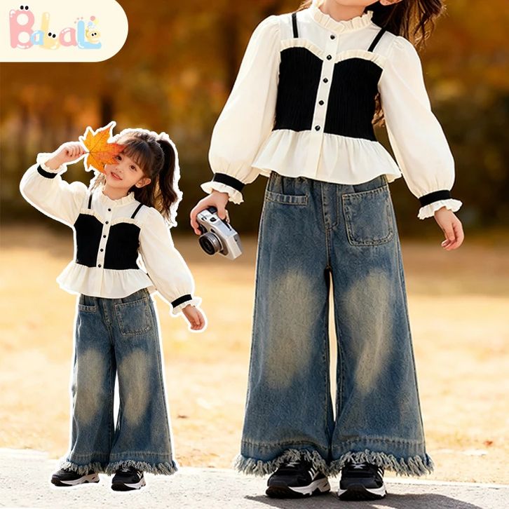 Korean Style Setelan Anak Perempuan Musim Gugur Kemeja Lengan Panjang Setelan Denim Serbaguna 250626