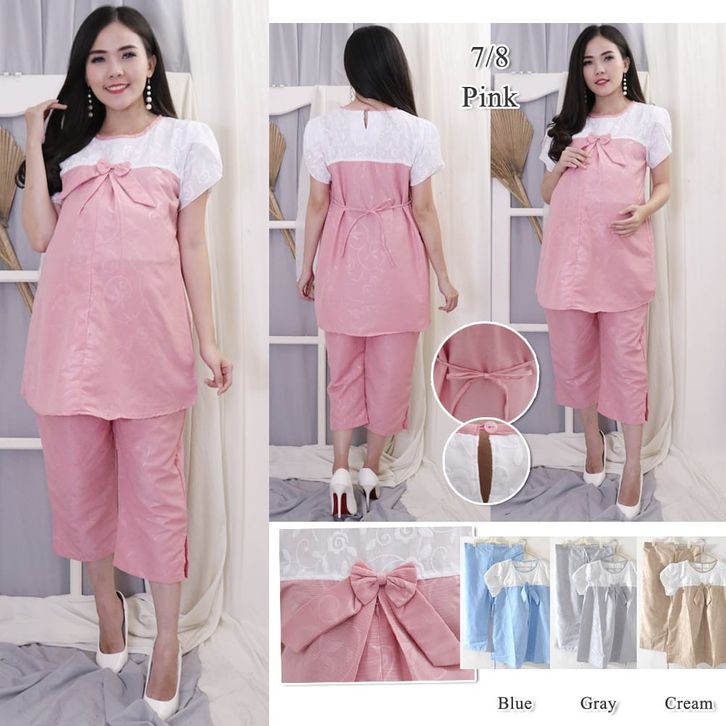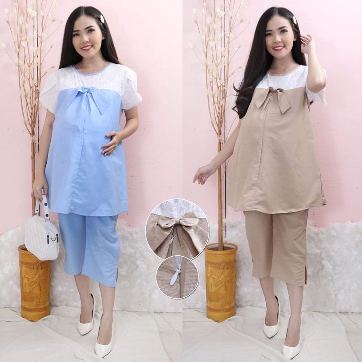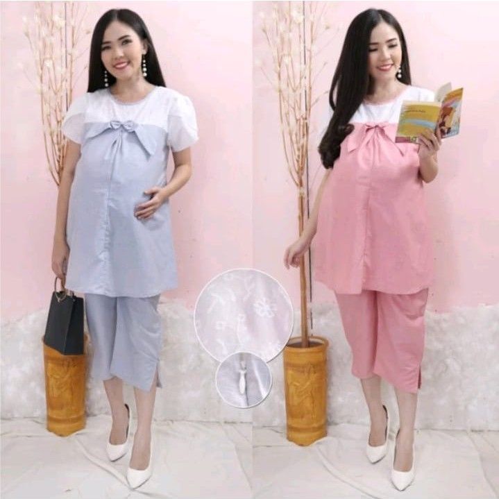 Setelan Baju Hamil Busui Wanita Sweet Motif Katun Embos Bergaris One Set Bumil Celana Atasan Embos Adem Premium Trend