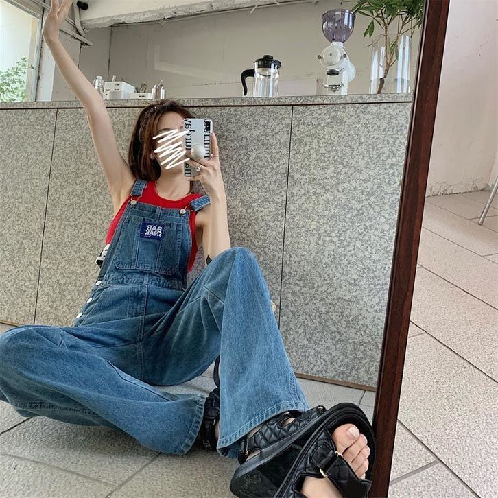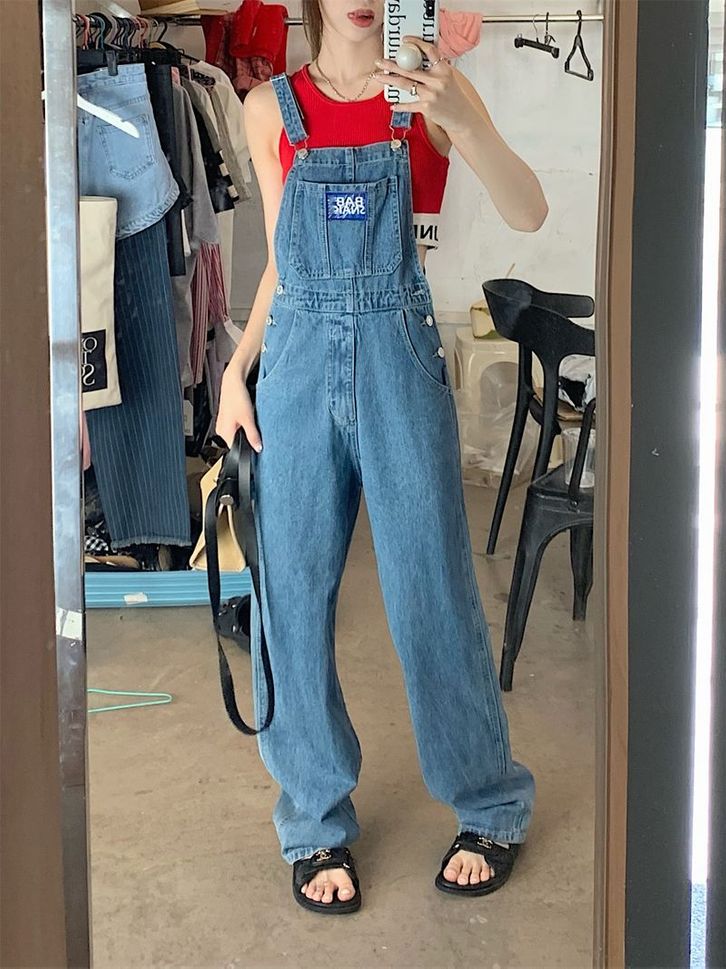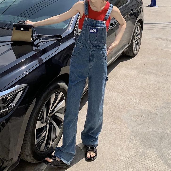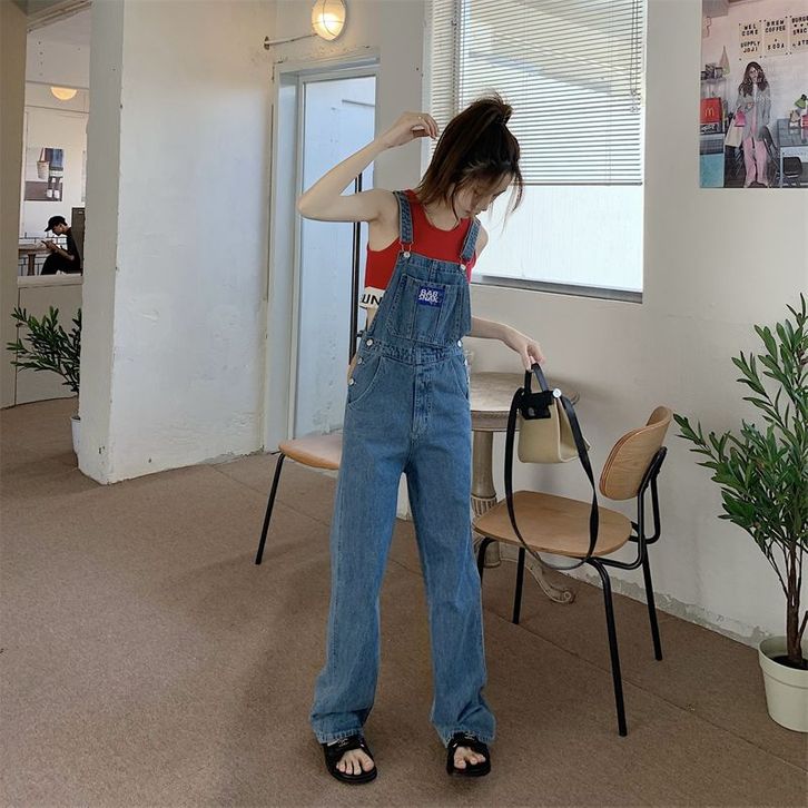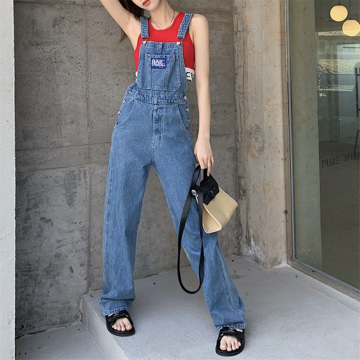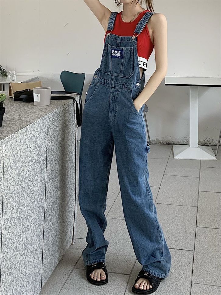 Celana Denim Overal Fashion Wanita Kodokan Kaki Lebar Terusan Korean Style Casual Kekinian Biru Size S