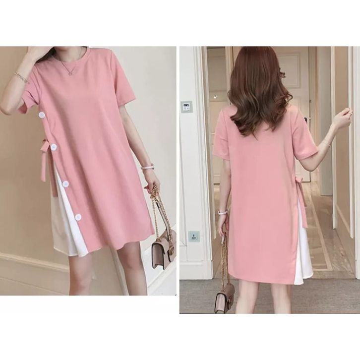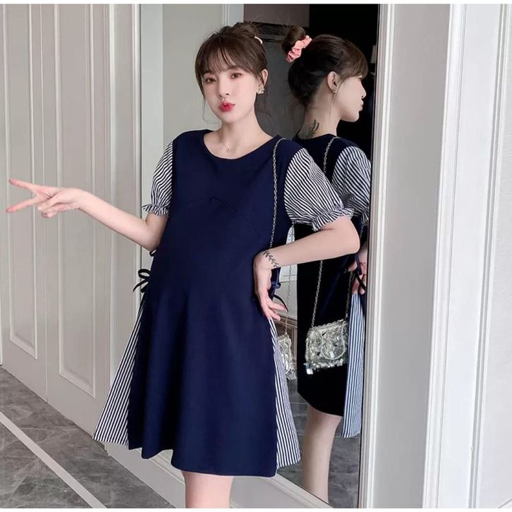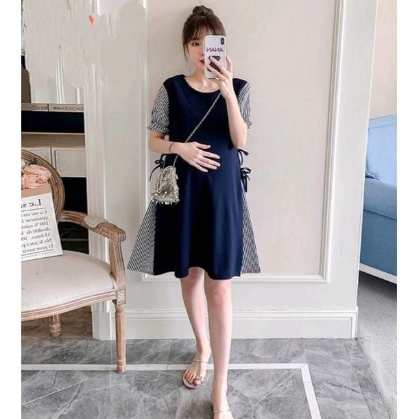 Dres Ibu Hamil Wanita Midi Bumil Perempuan Korean Style Casual Santai Bahan Katun Kombi Strip Salur Stylish