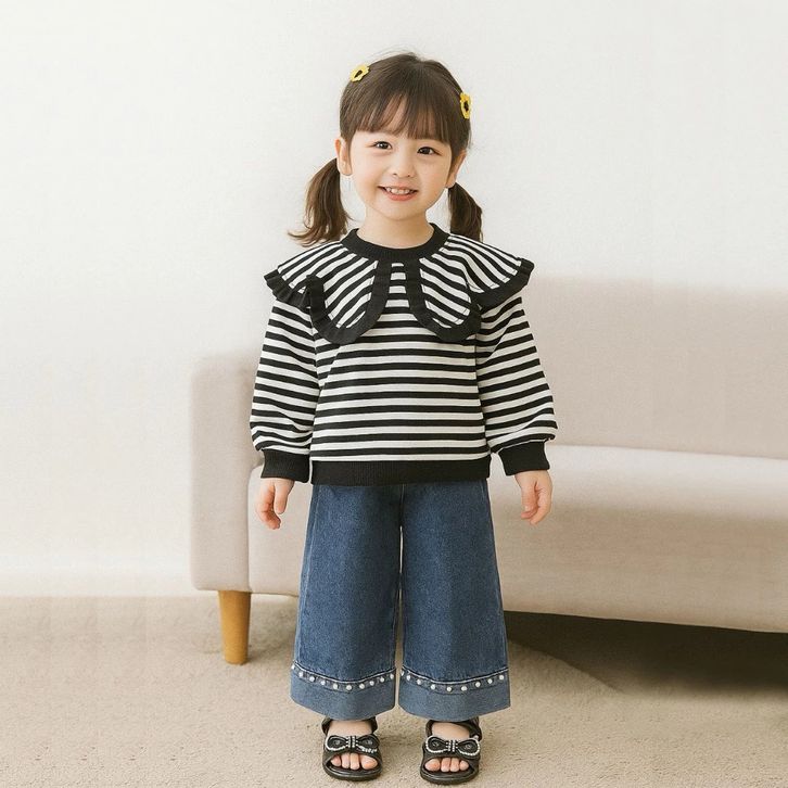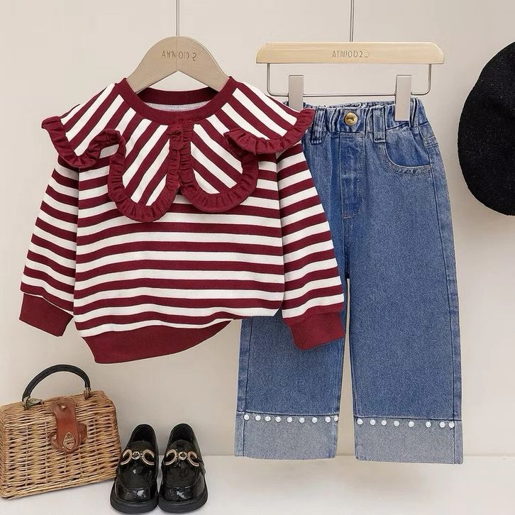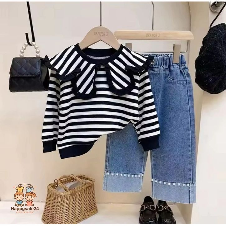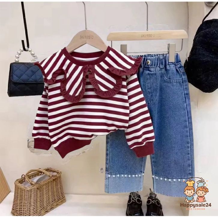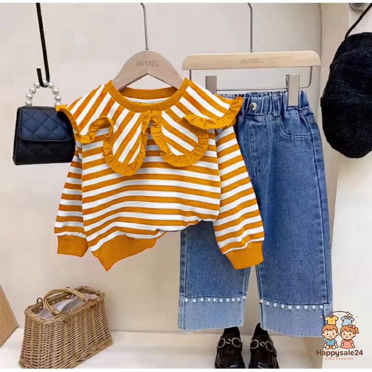 Setelan Celana Jeans Atasan Ruffle Salur Cantik Fashion Korean Style Kekinian Setelan Anak Perempuan 1-5 Tahun