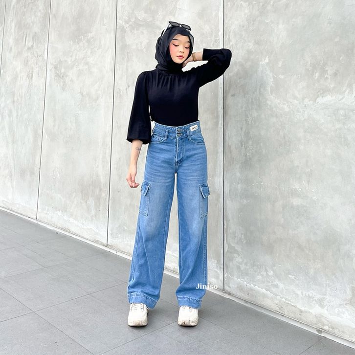 Jeans High Waist Wanita JINISO FEARLESS 461 Highwaist Cargo Loose Jeans Celana Panjang Wanita