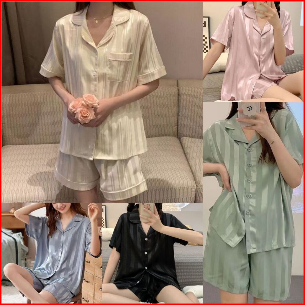 Baju Tidur Wanita Dewasa Kyara Short Sleepwear Piyama Set Satin Silk Setelan Garis Warna Polos Pakaian Tidur Lengan Pend