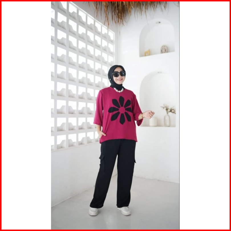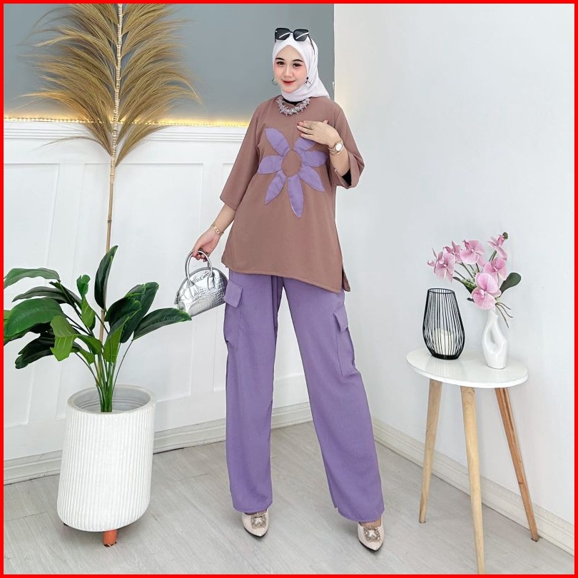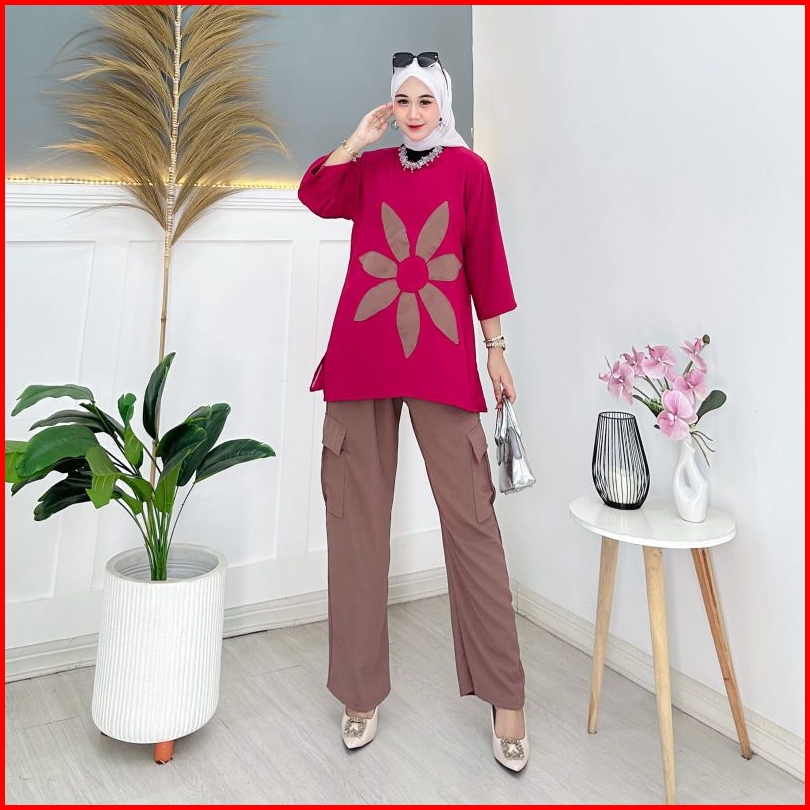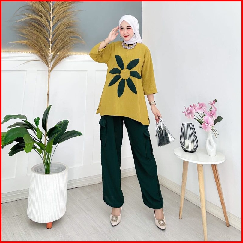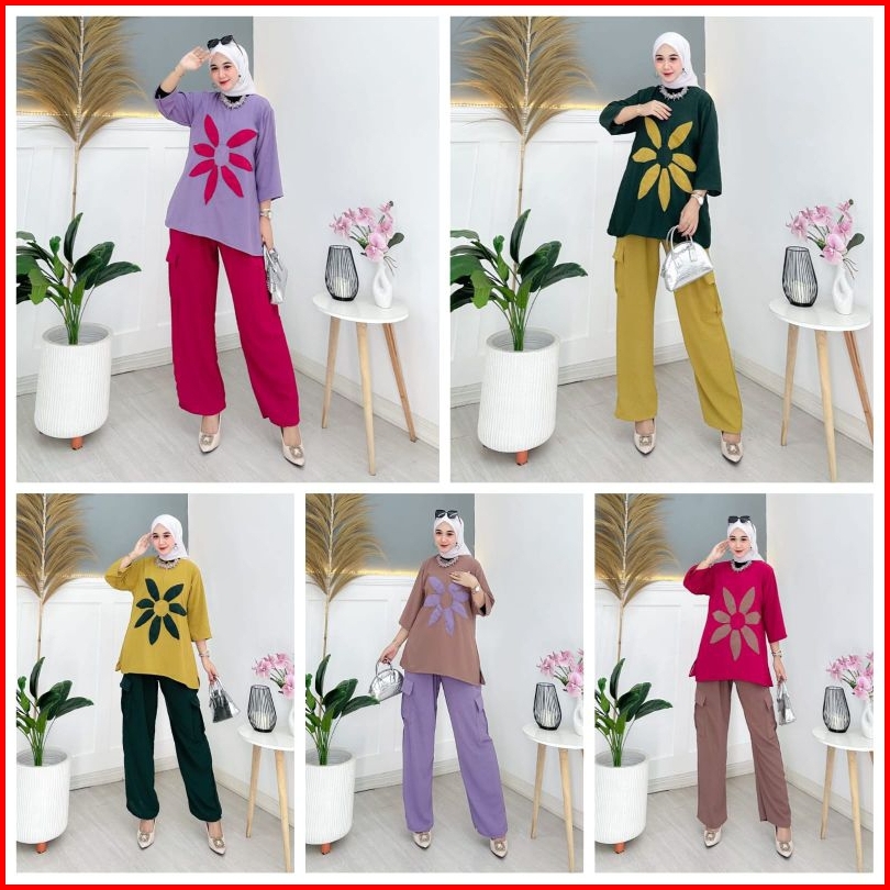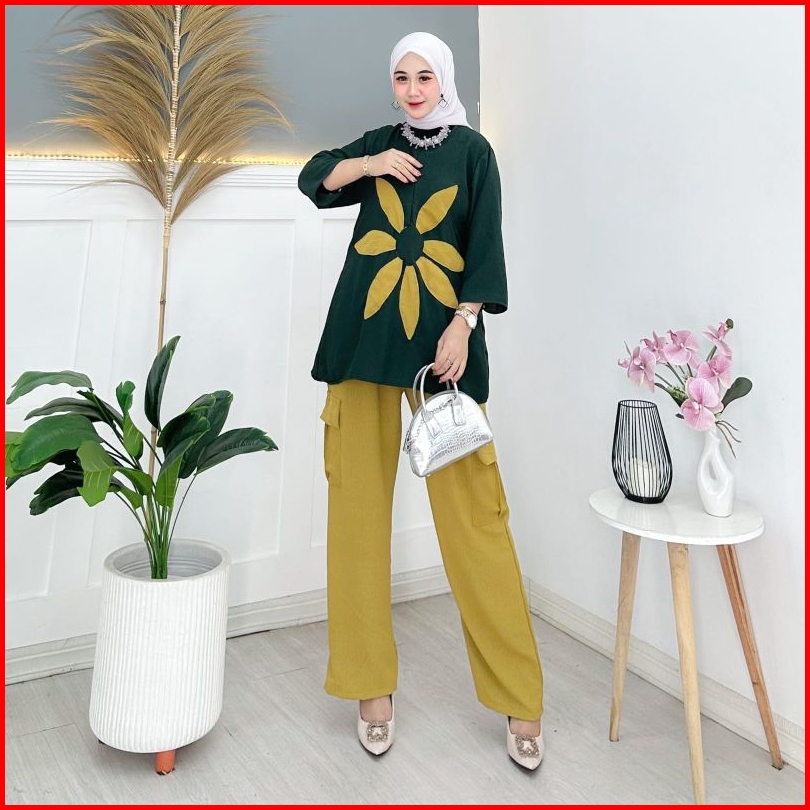 Setelan Cargo Bunga Oneset Crincle Wanita Dewasa Kekinian