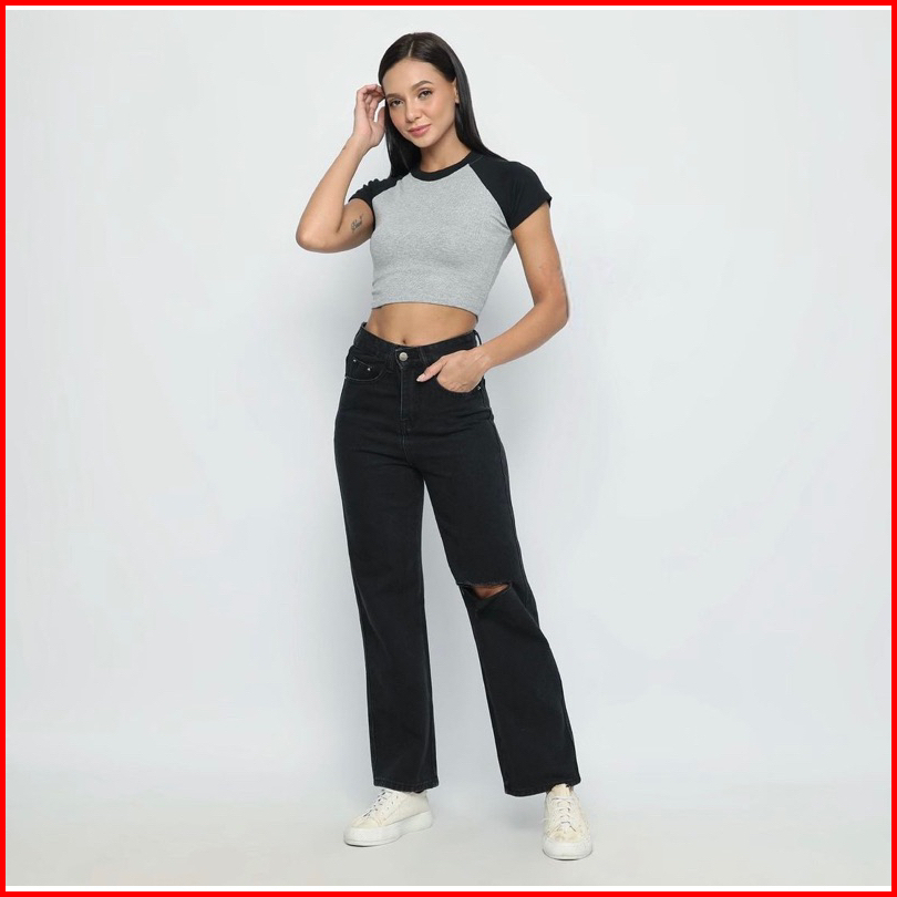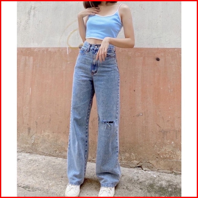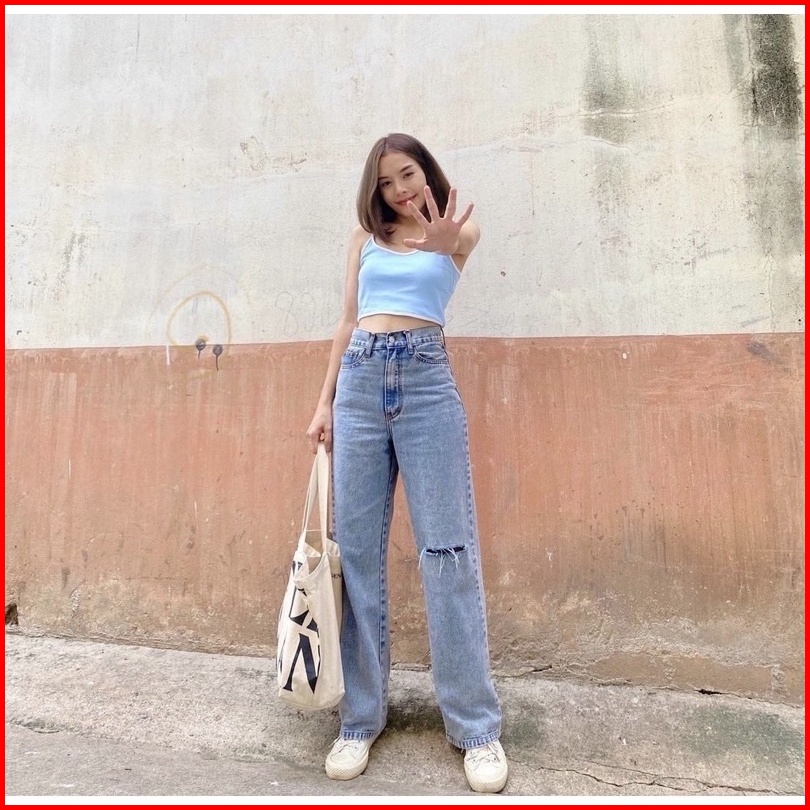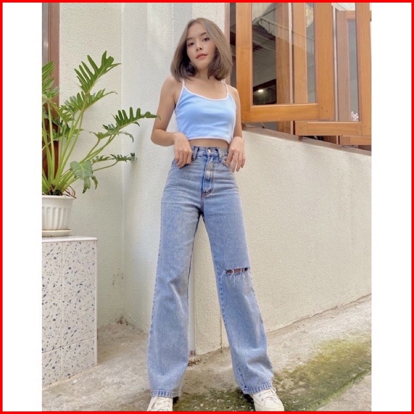 Thegirlhouse - Celana Highwaist Kulot Loose Jeans Wanita Sobek Lutut