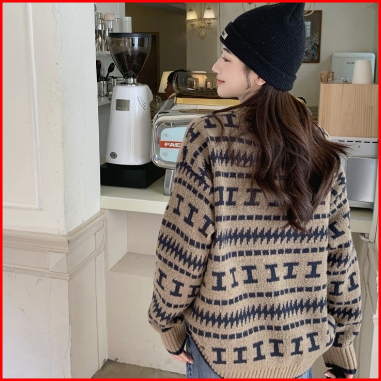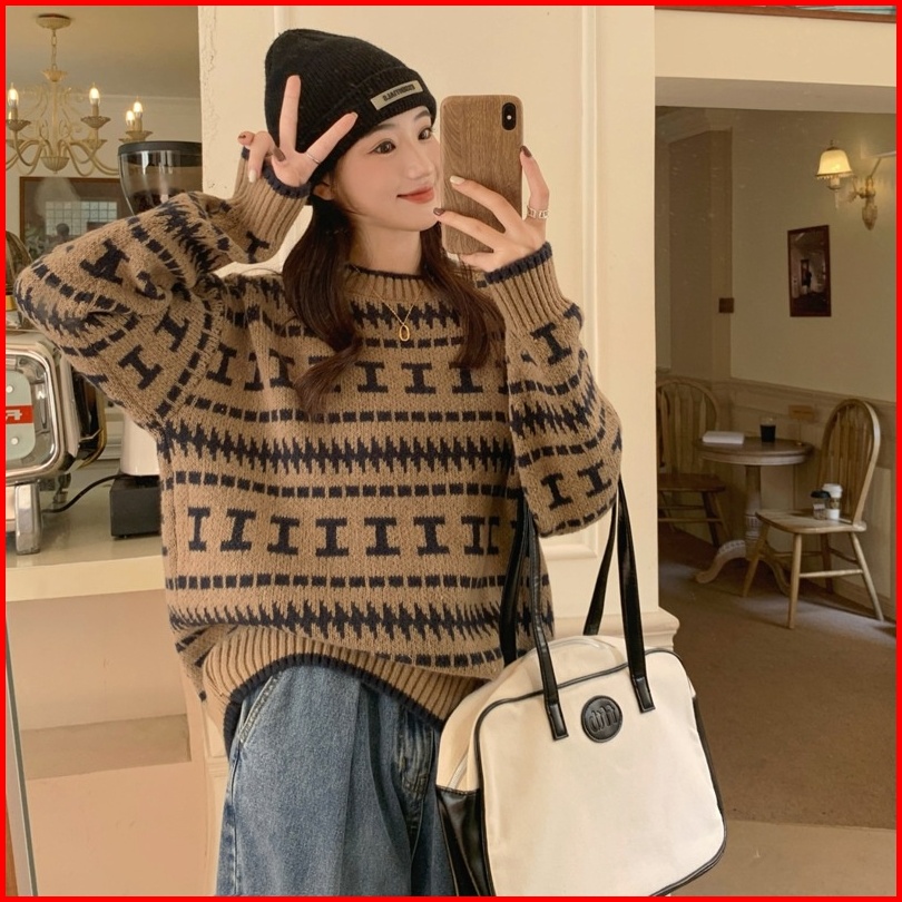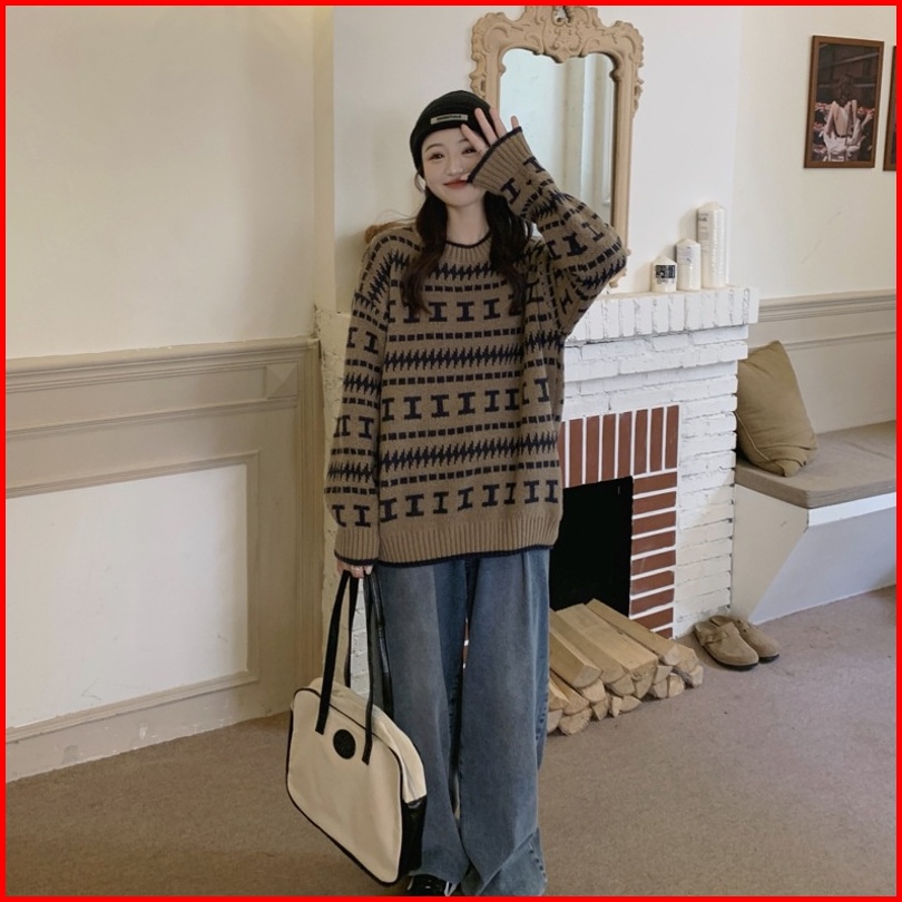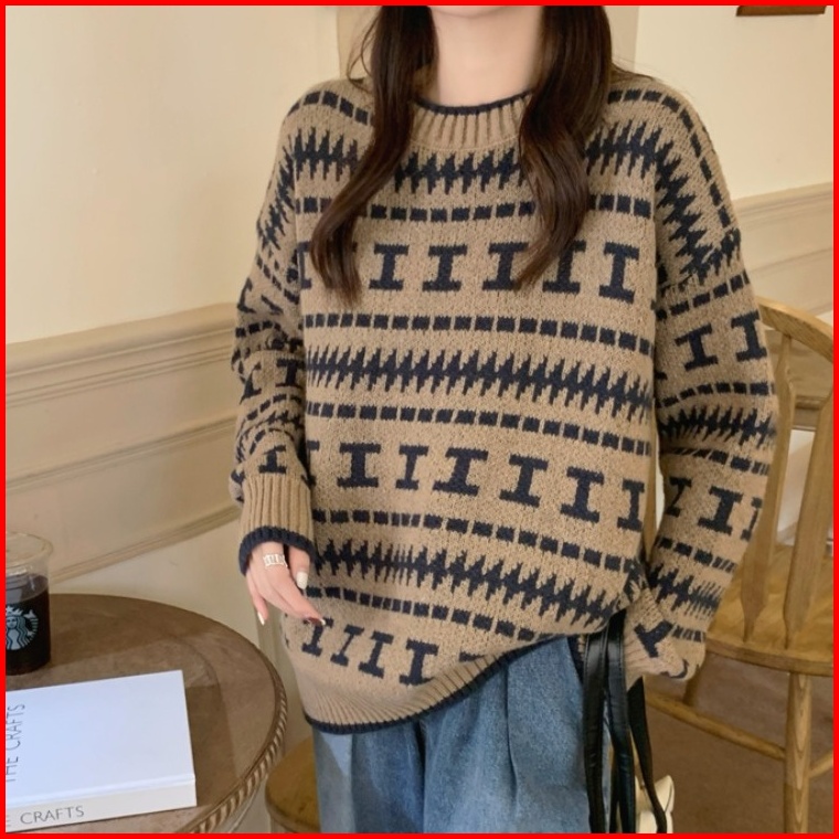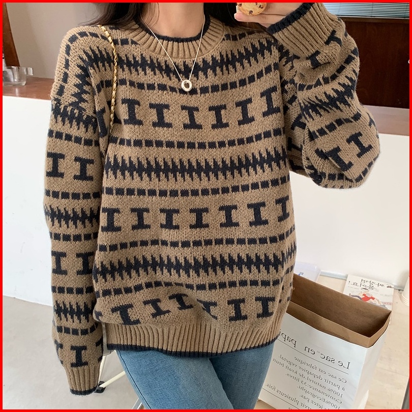 Sweater Pullover Leher Bulat Jacquard Longgar Yang Chic Untuk Wanita