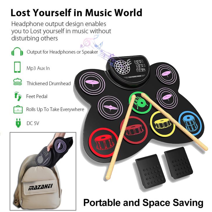 Drum Elektronik Rixton Portabel Digital USB 7 Bantalan Roll Up Drum Set Silicone Electric Pad Kit