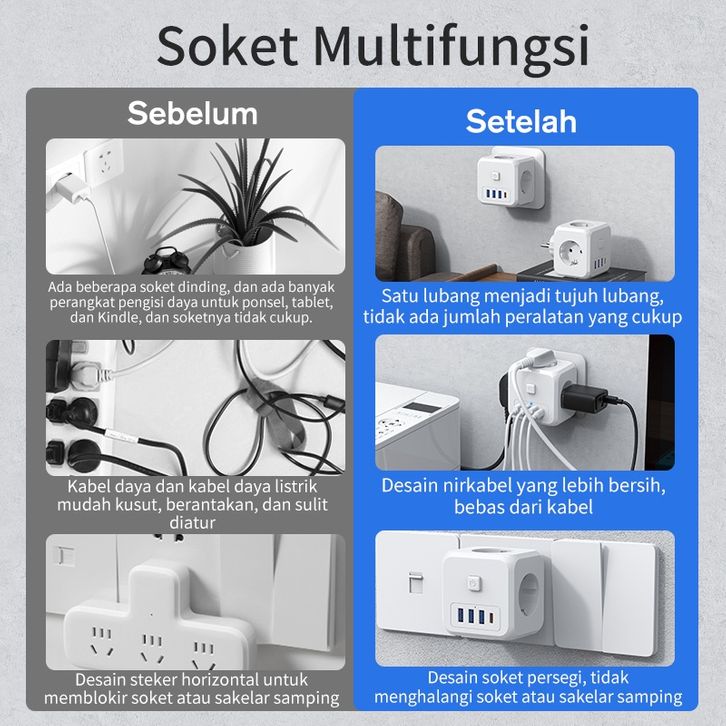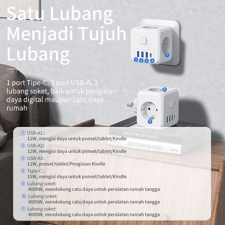 KIVEE 7 in 1 Stop kontak Colokan listrik USB+Type C Fast charging Daya Max mendukung 4000W