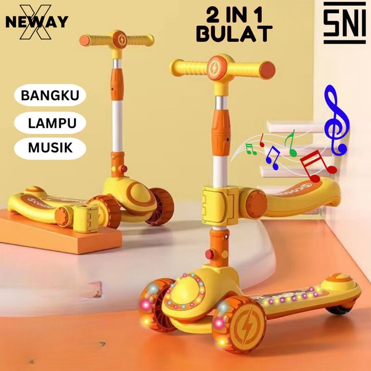 Scooter Mainan Anak Bulat 2 in 1 Skuter Lipat Roda Tiga Otoped Lampu Musik Rem Edukasi Anak