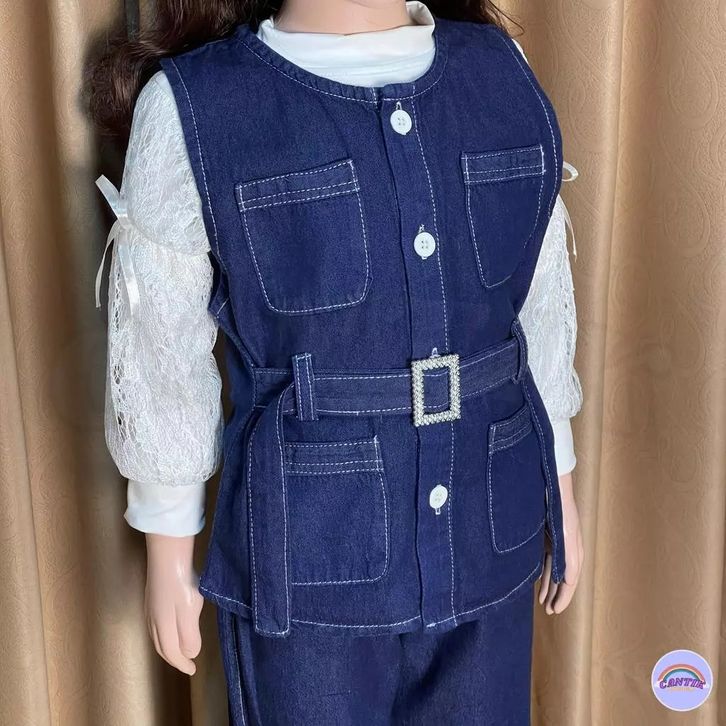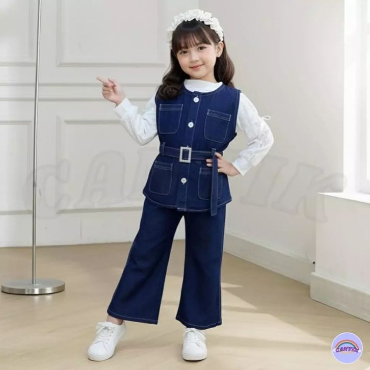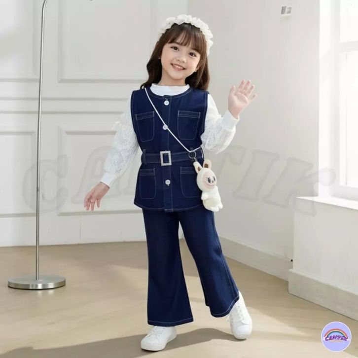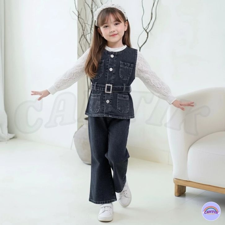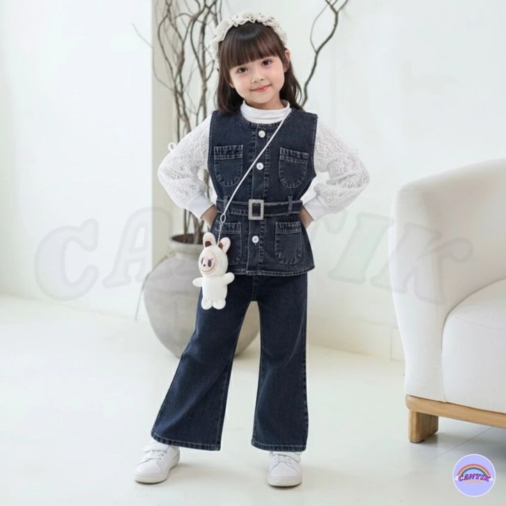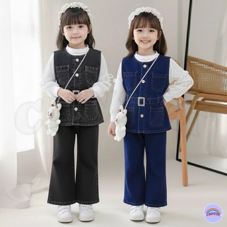 Setelan 3in1 Rompi Full Denim Lengan Panjang Celana Jeans Cutbray Anak Perempuan 3-12 Tahun Baju Anak Cewek Import