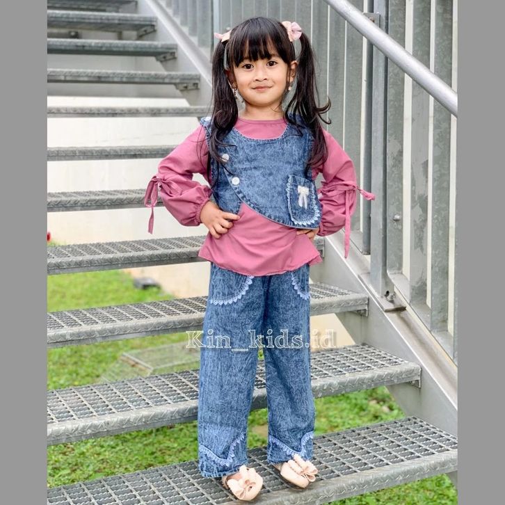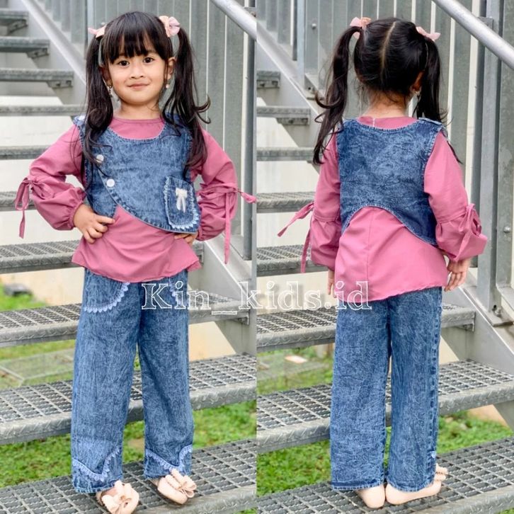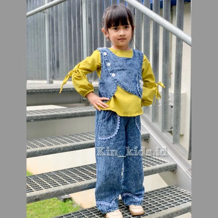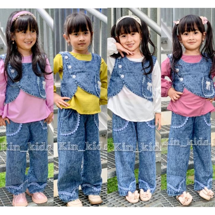 Setelan Baju 3in1 Rompi Vest Jeans Baju Katun Polos Lengan Balon Celana Jeans Kulotset Baju Anak Perempuan 3-12 Tahun
