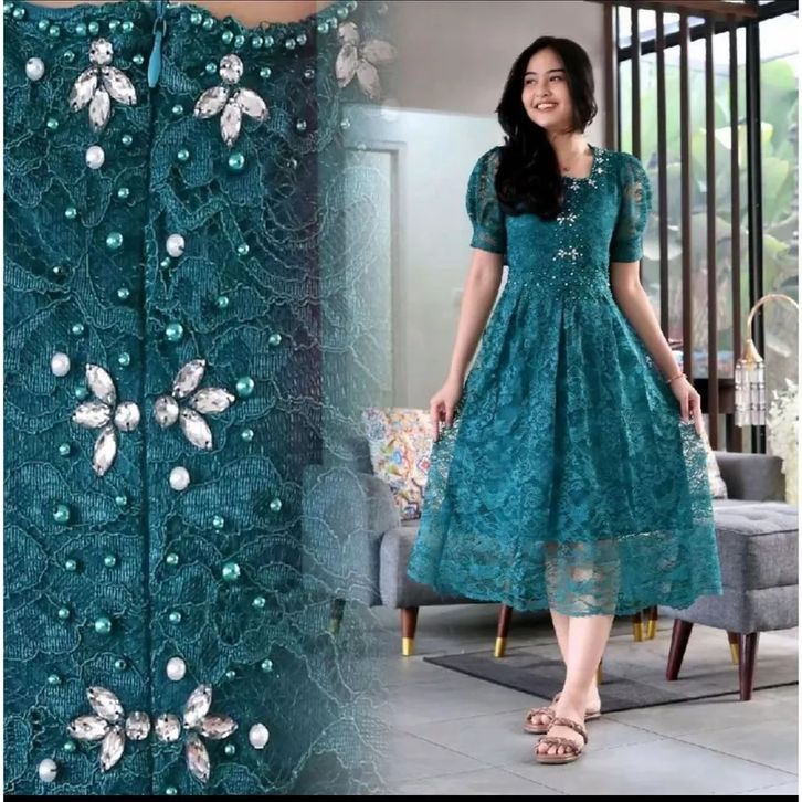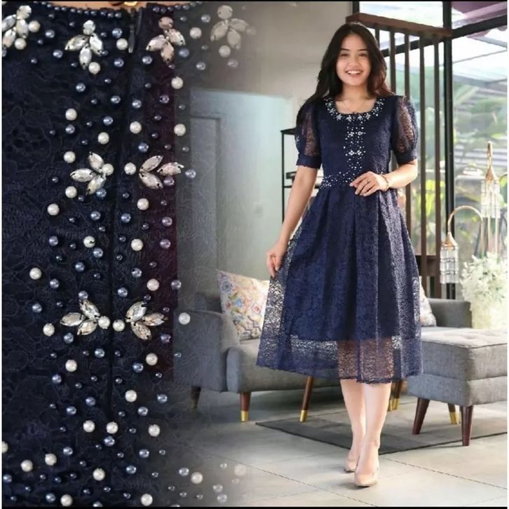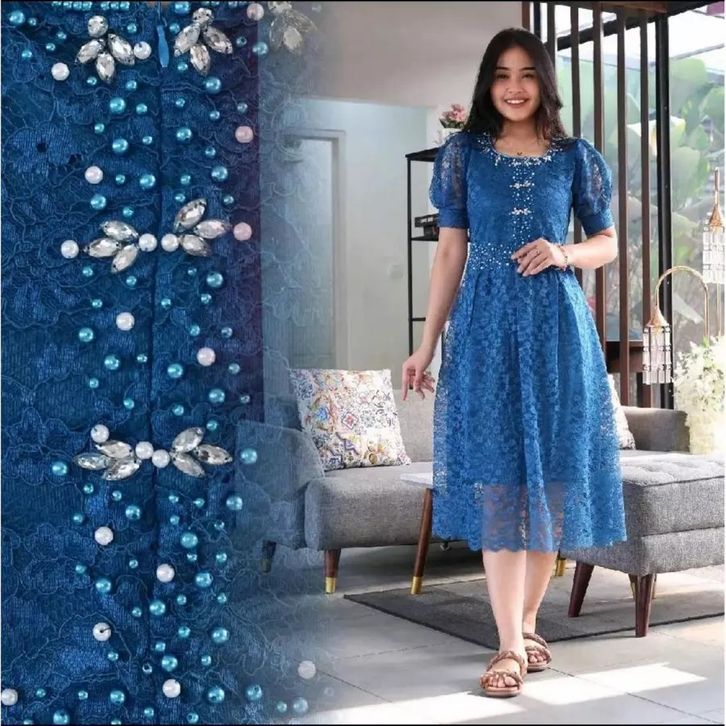 Gisella Dress Payet Gaun Dress Brokat Pesta Payet Mutiara Premium Model Baru 2025 Dres Midi Natal Lengan Pendek Wanita