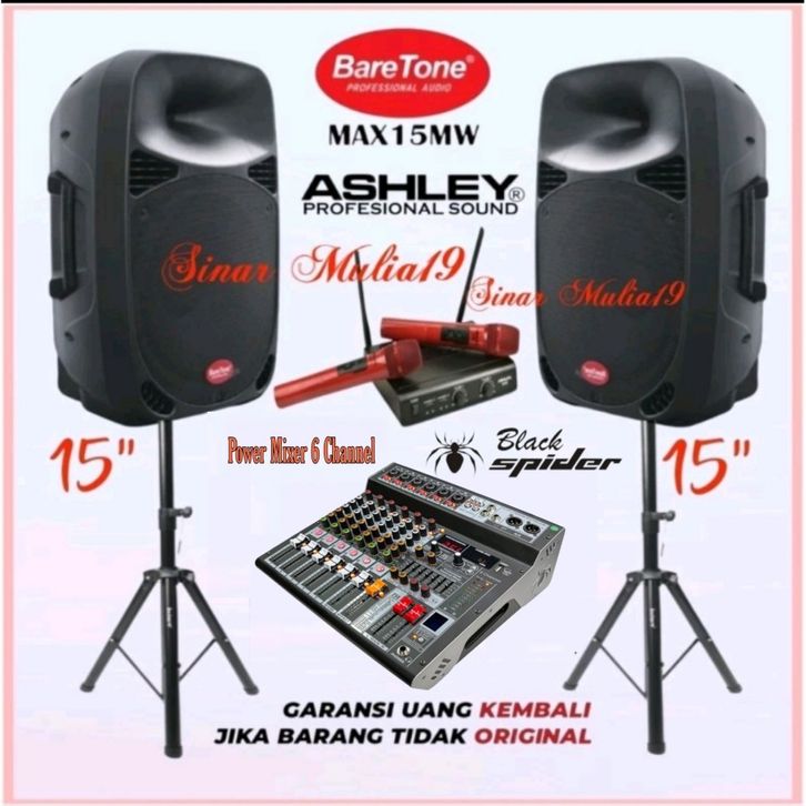 Paket Sound System Karaoke Speaker 15 Inch BareTone Power Mixer BlackSpider NX-6 Mic Wireless Ashley Original
