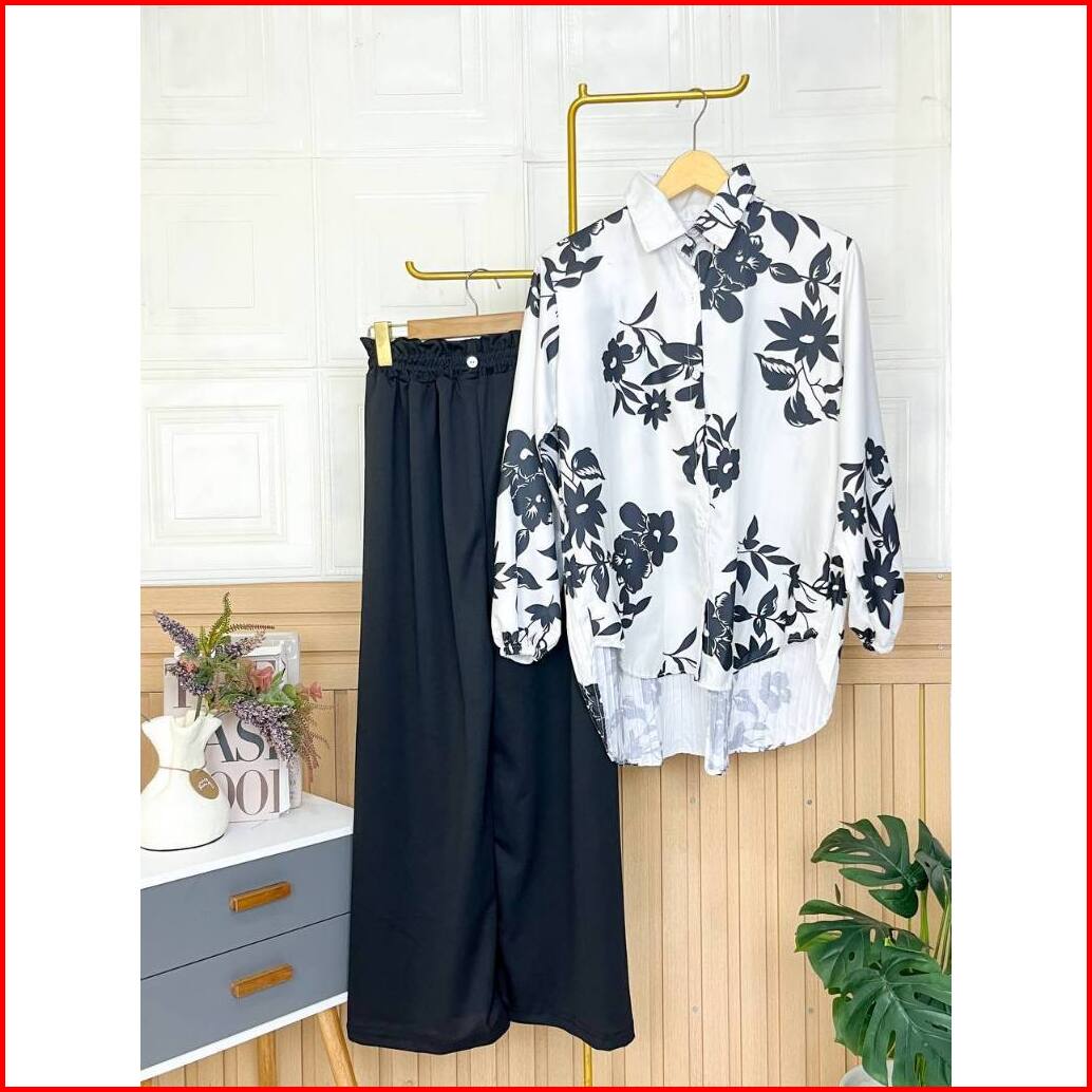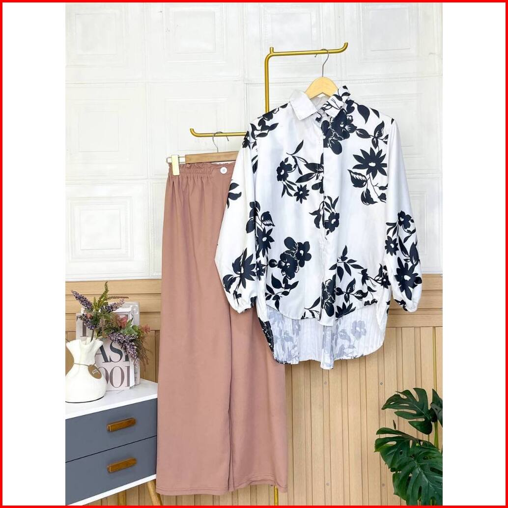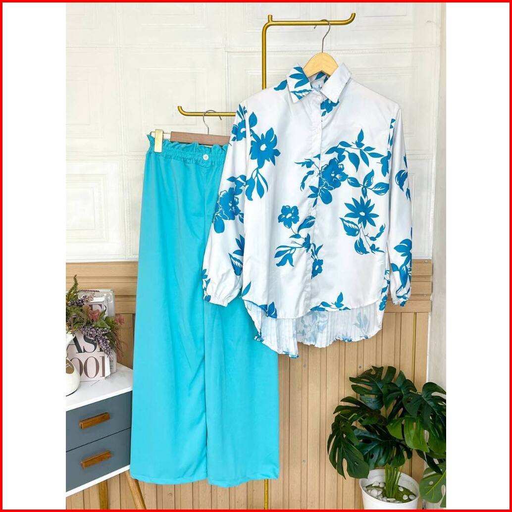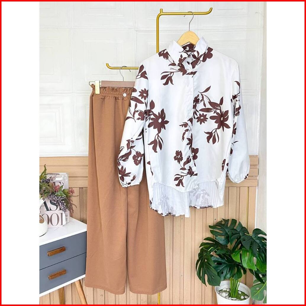 Oneset Munna Plisket Set Wanita Motif Bunga Atasan Celana