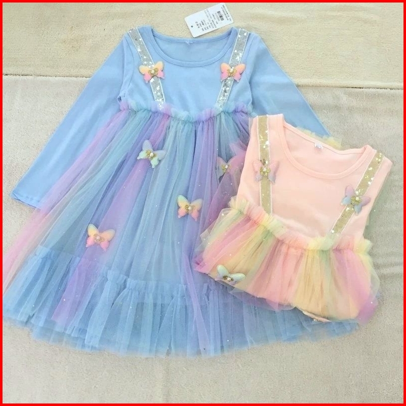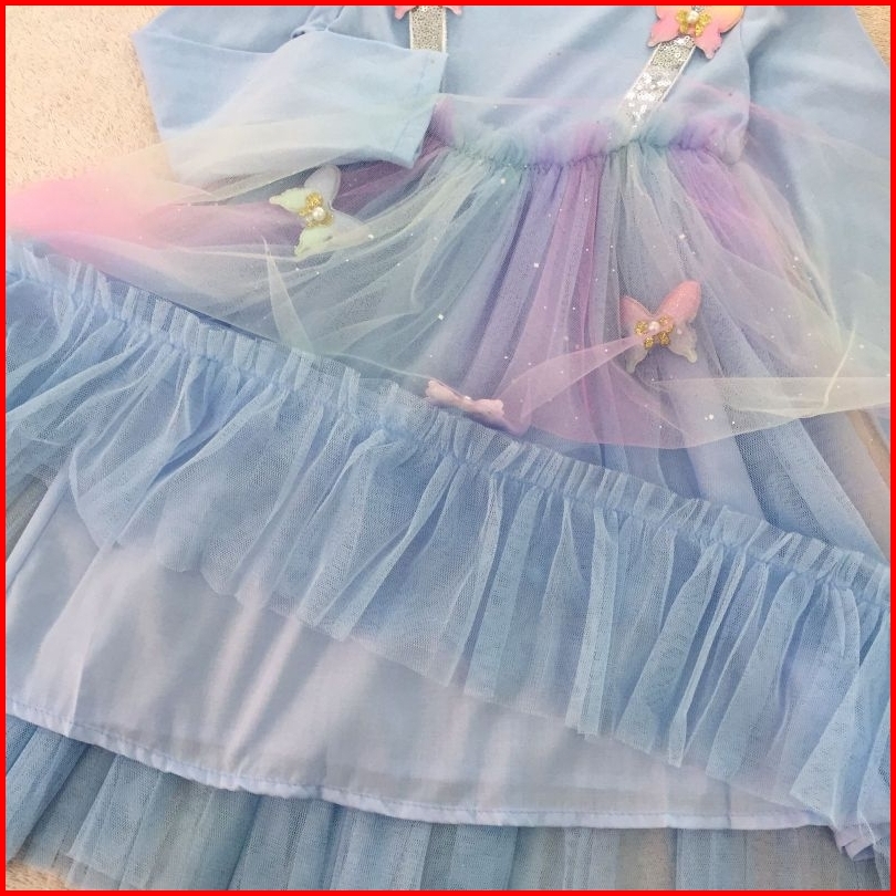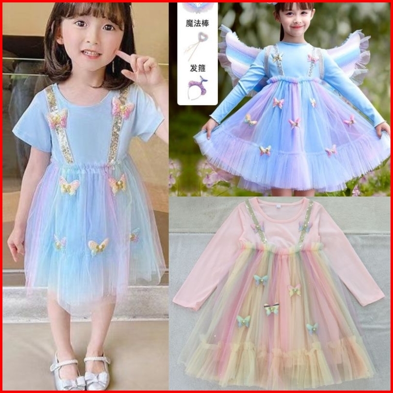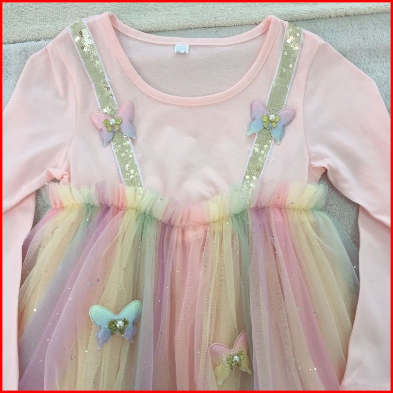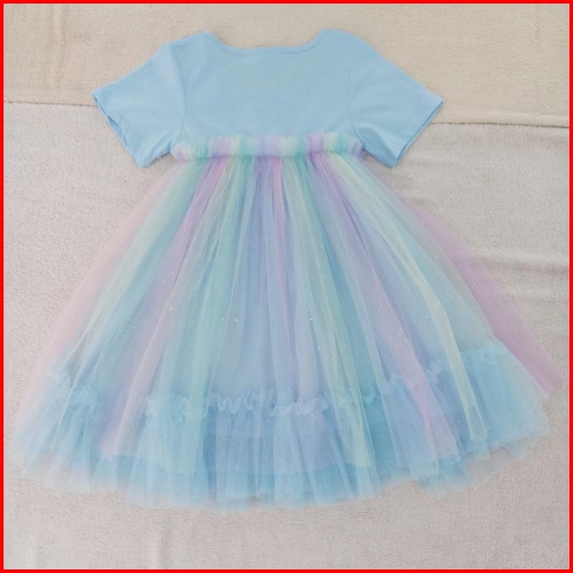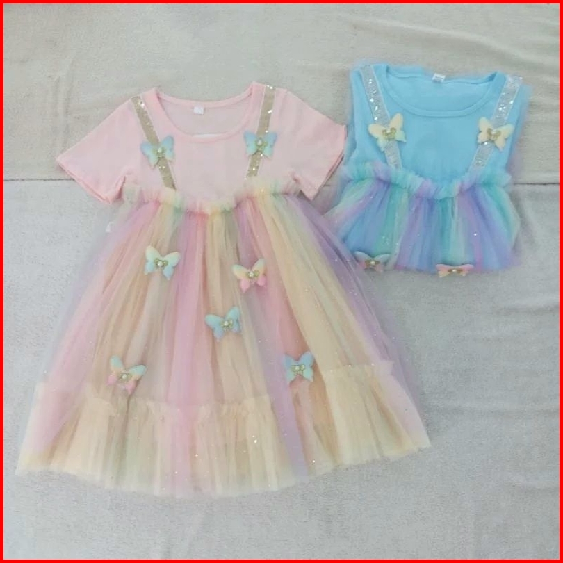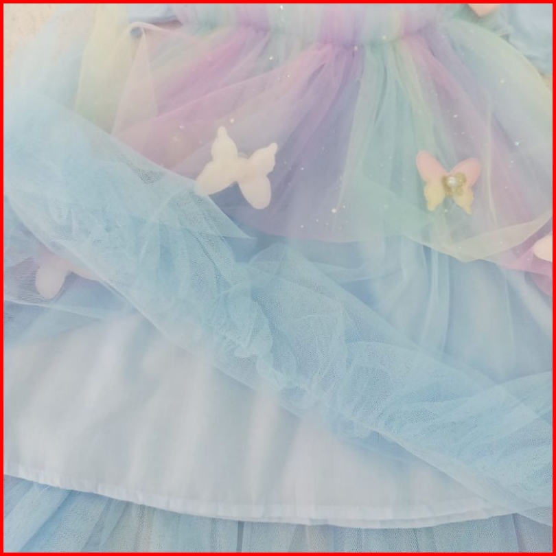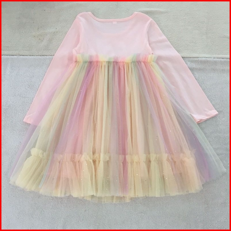 2-8th Dress Kupu Rainbow Anak Import Gaun Pesta Biru Pink Pelangi Tutu Tule Lengan Panjang Pendek