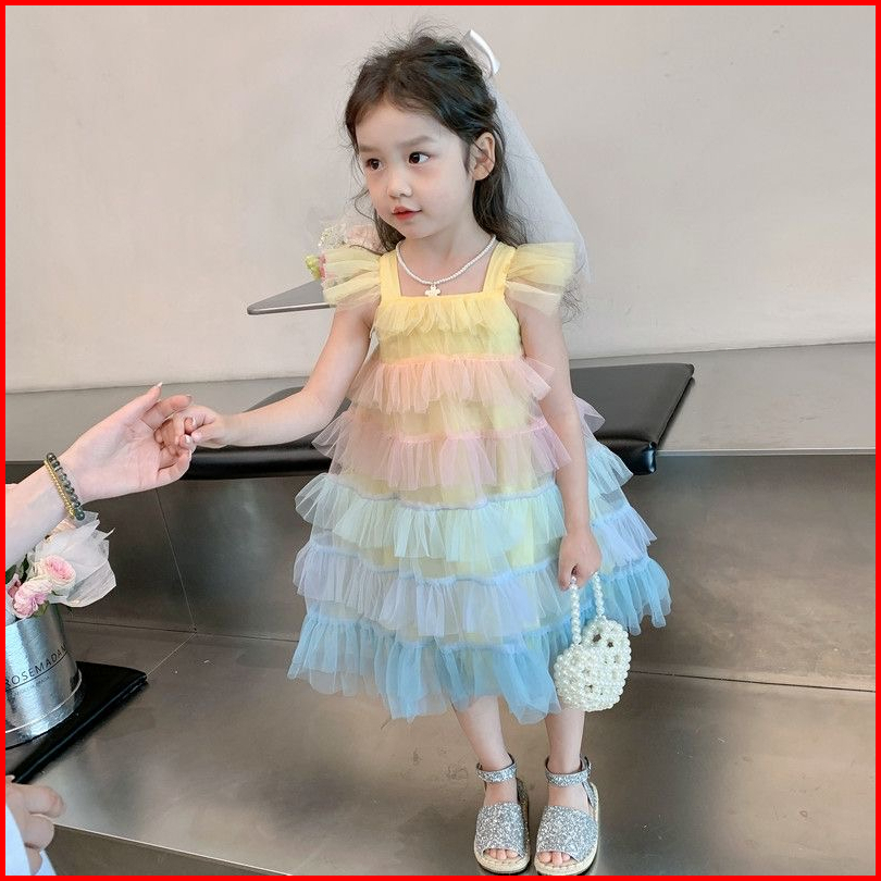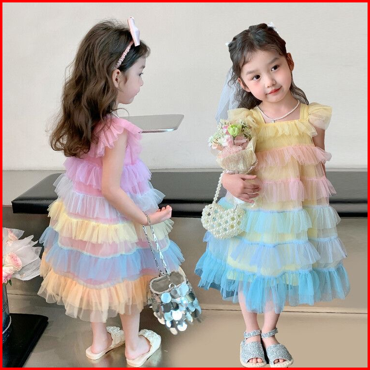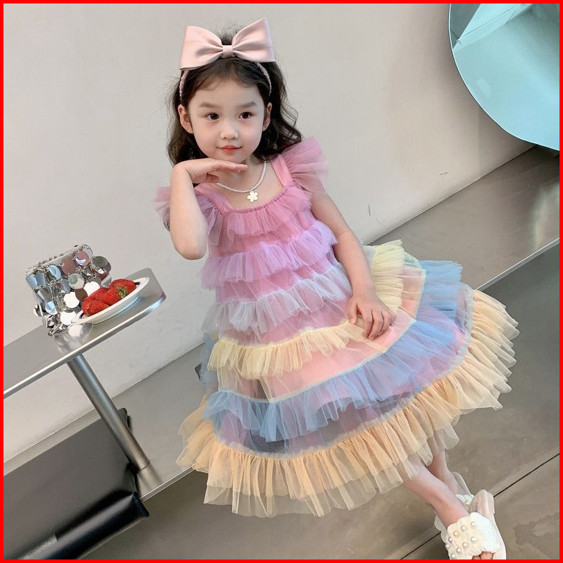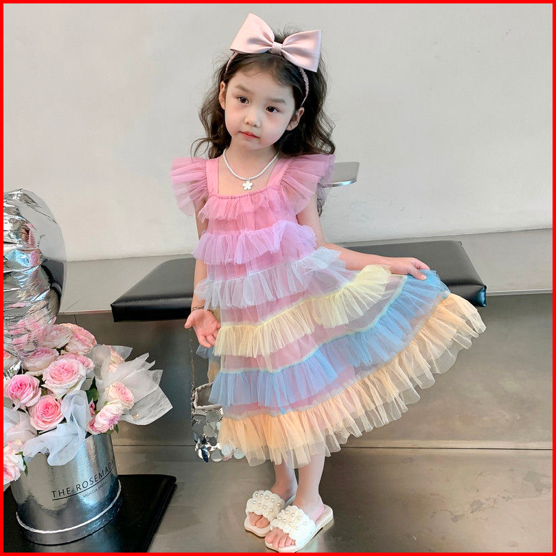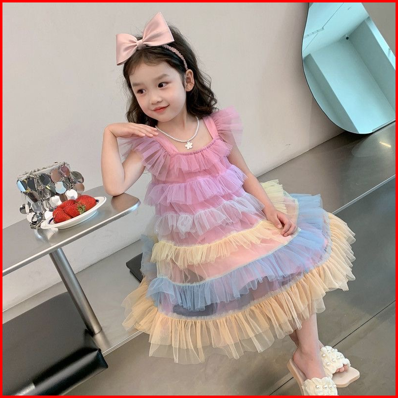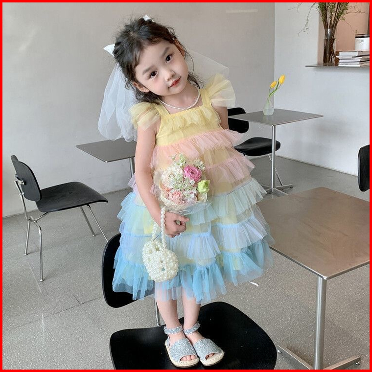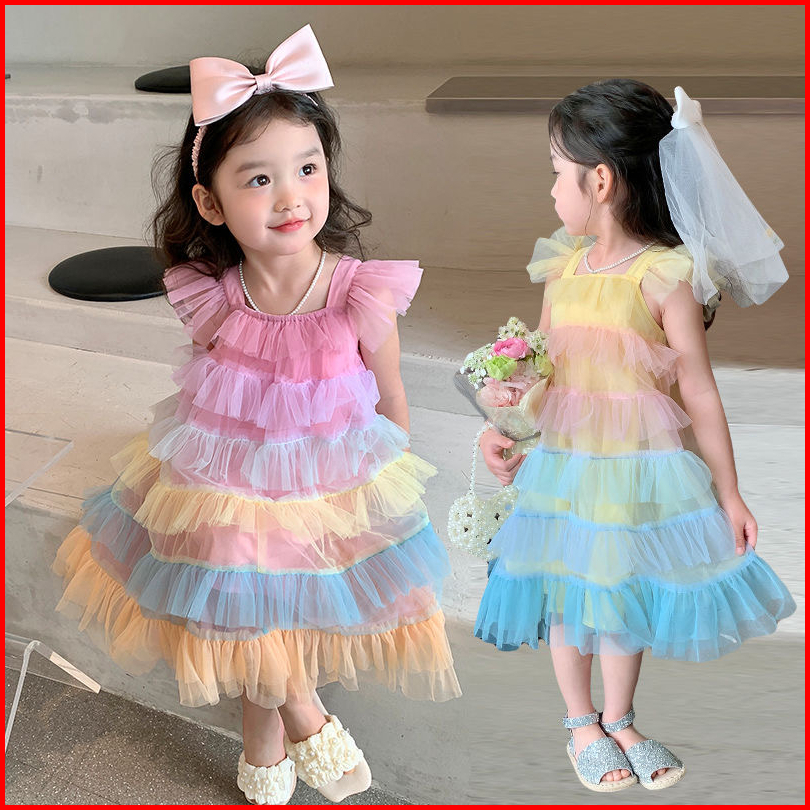 Haasya Kids 2-7 Tahun Rok Anak Perempuan Musim Panas Gaun Jaring Tanpa Lengan Pelangi Versi Korea Anak-anak Baru Rok Put