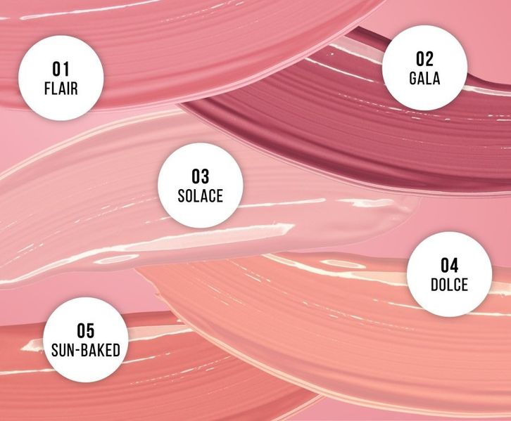 Blush 01 FLAIR , Blush 02 GALA , Blush 03 SOLACE, Blush 04 DOLCE, Blush 05 SUN BAKED