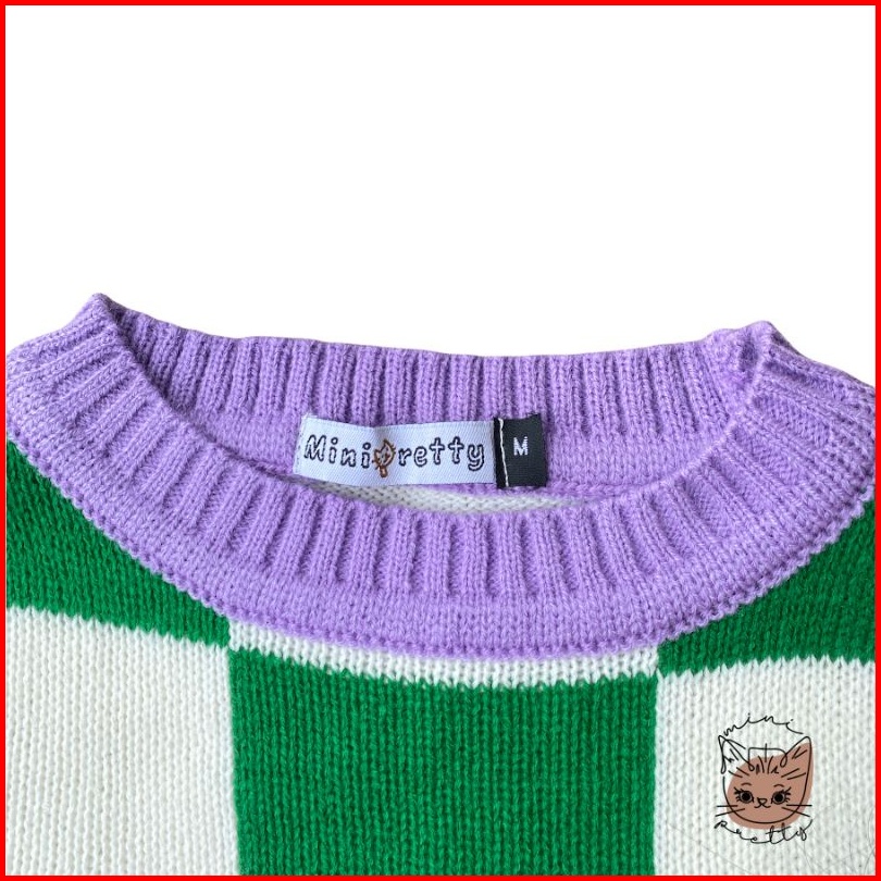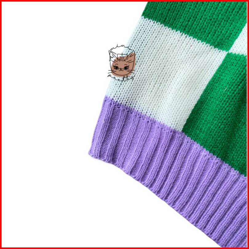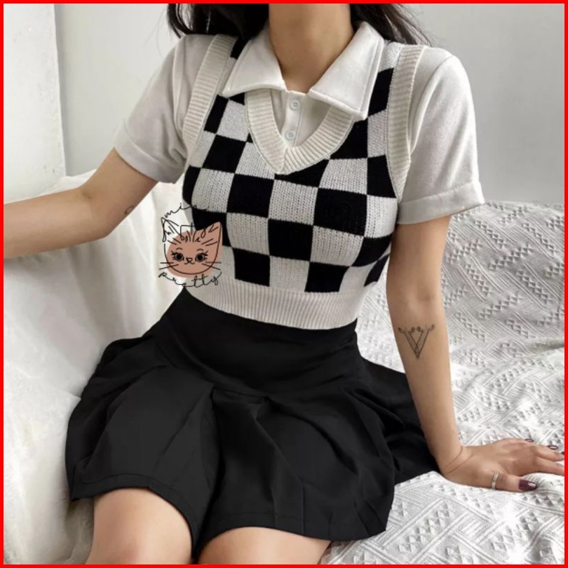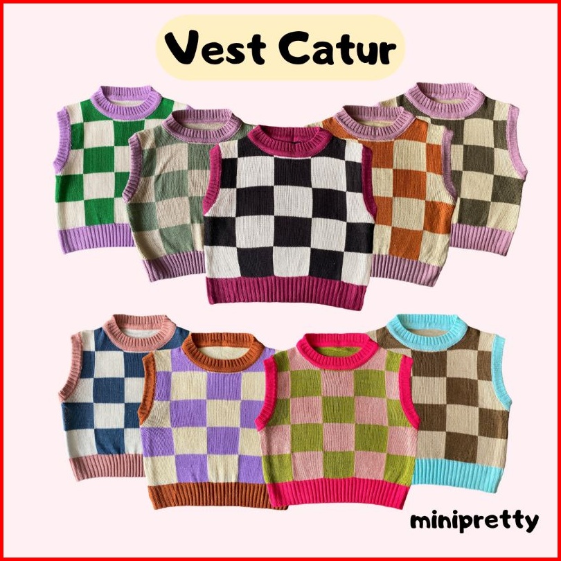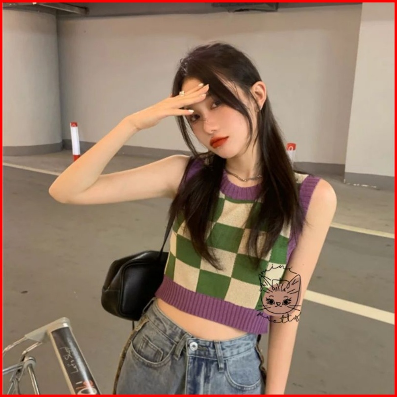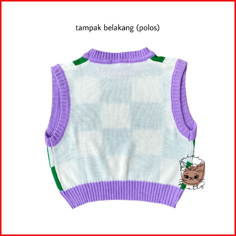 Vest Knit Kotak Rompi Rajut Crop Motif Catur