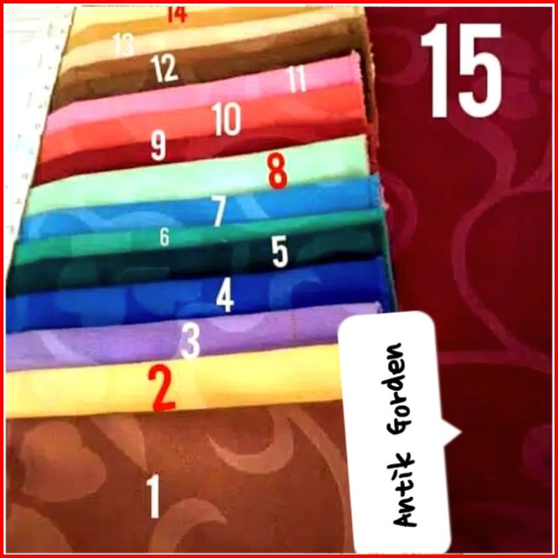 Merah maroon, Coklat tua, Biru tua, Abu tua, Gold, Ungu muda, Ungu tua, Ping, Hijau tua, Hijau muda, Oren, Merah bata, Biru muda, Abu muda, Coklat muda, Hitam