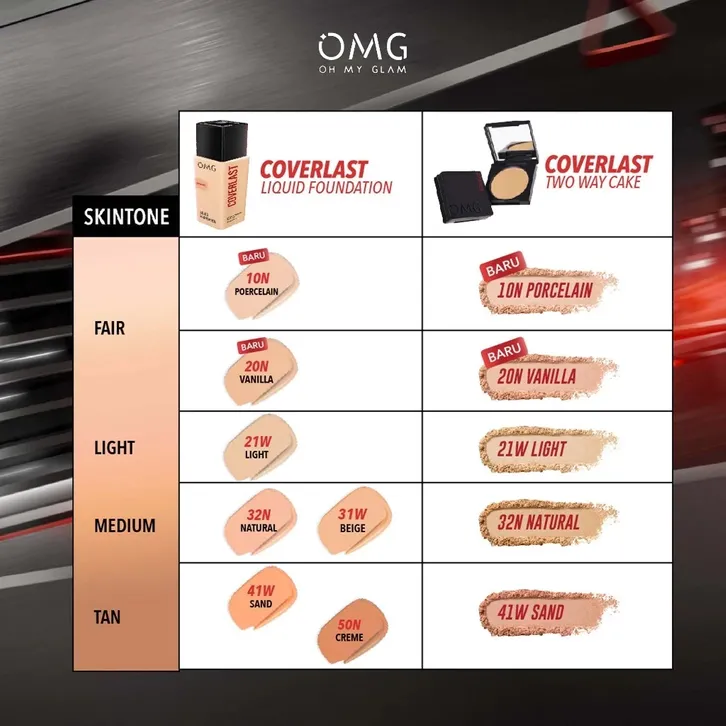 OMG Found 20N Vanilla, OMG Found 21 W Light, OMG Found 31 W Beige, OMGFound 32N Natural, OMG Found 41 W Sand, OMGFound 52N Creme, OMG TWC 32N Natural, OMG TWC 21W Light, OMG TWC 41W Sand, 20N Vanilla, 10N Porcelain