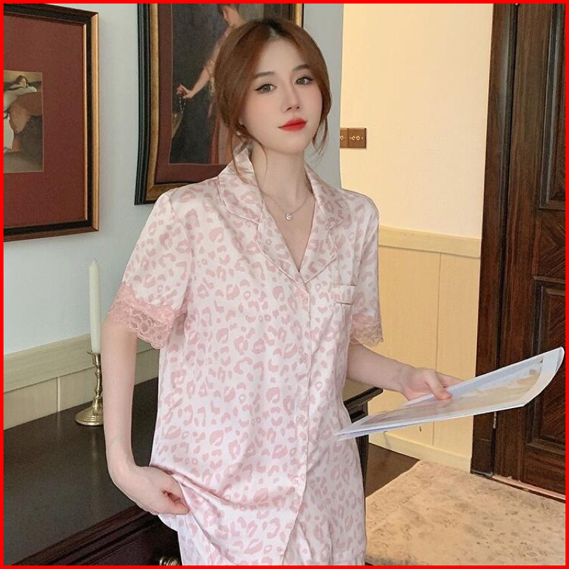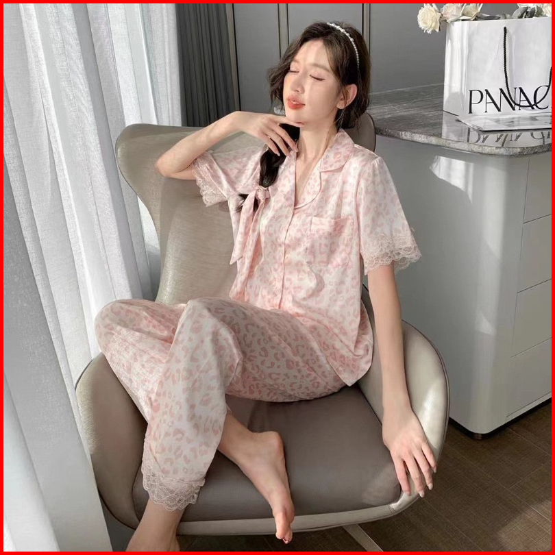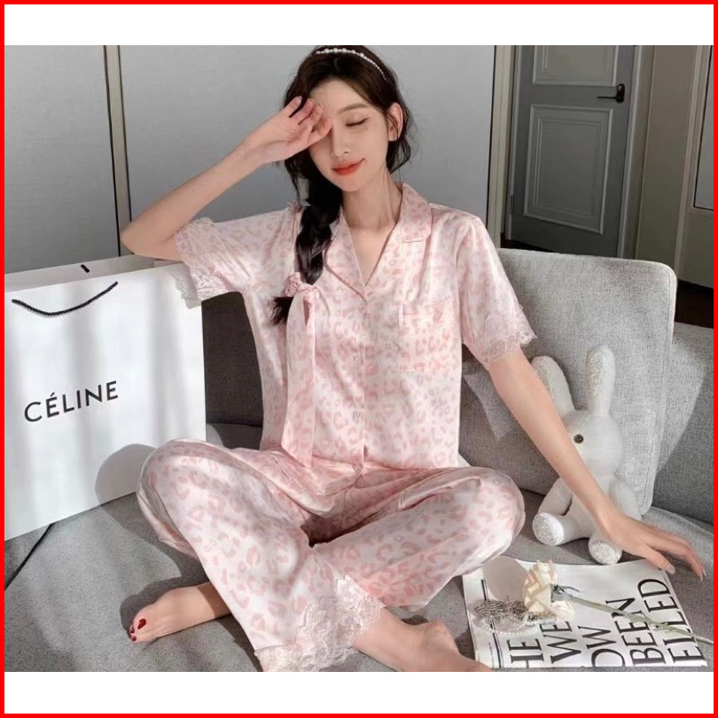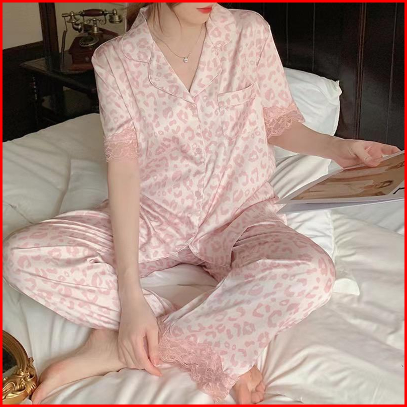 002 Ultra Luxury Sleepwear Kelas Atas Piyama Satin Lengan Pendek Celana Panjang Lengan Bunga Kancing Hidup Bahan Satin H