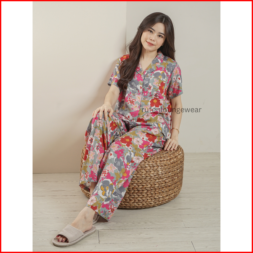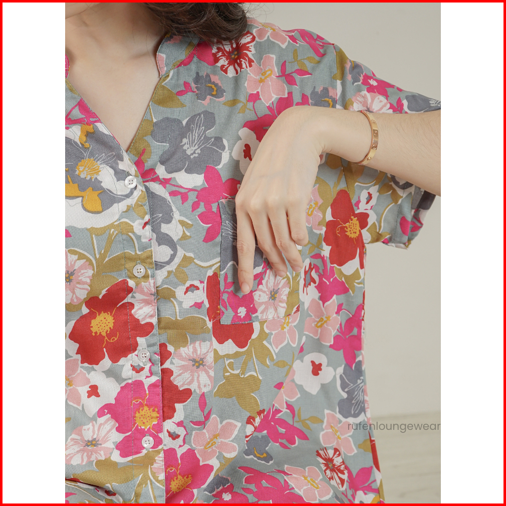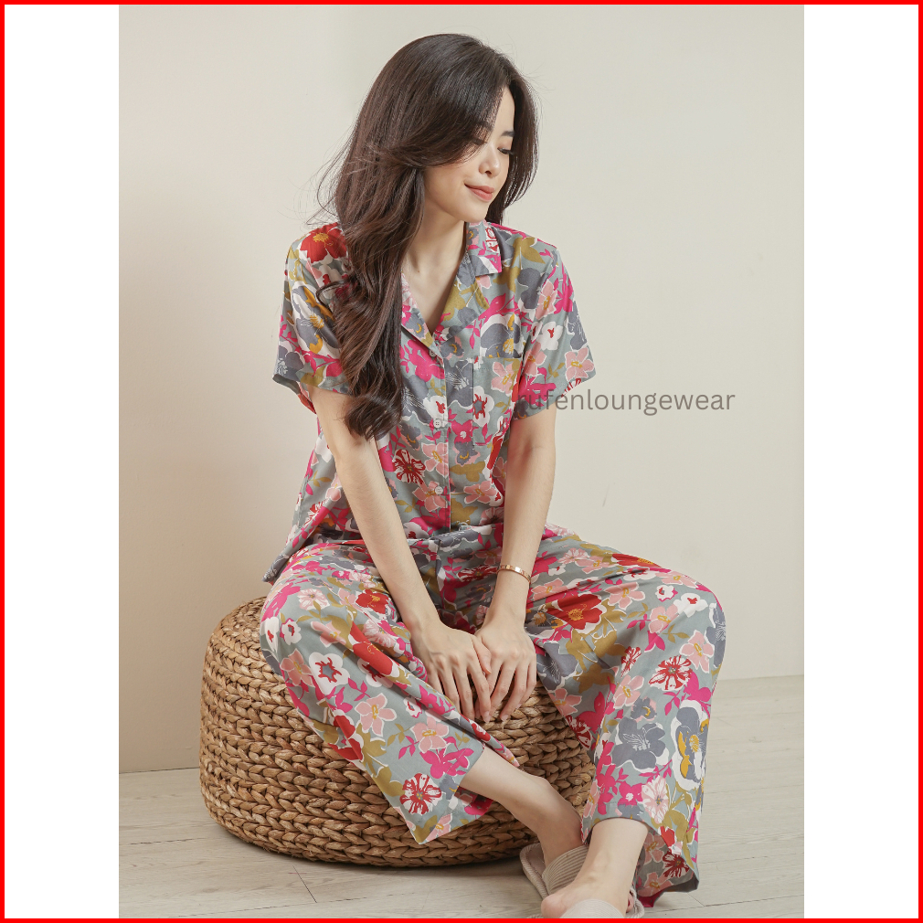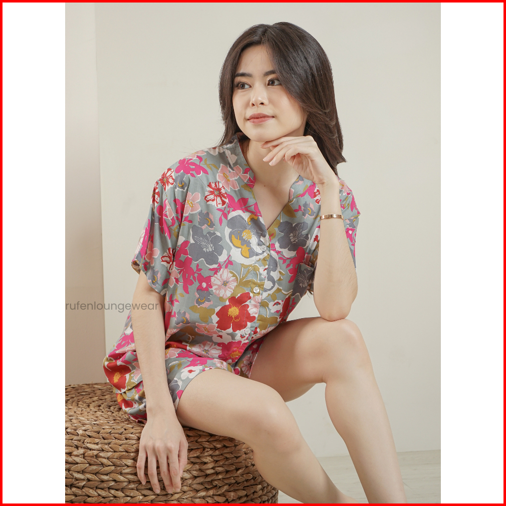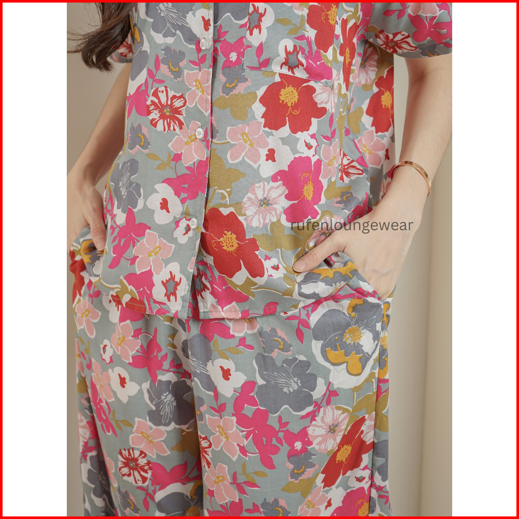 Setelan Rayon Celana Panjang Pendek Baju Tidur Wanita Lengan Pendek Motif Bunga