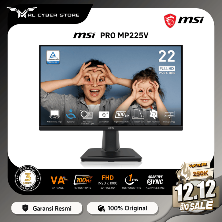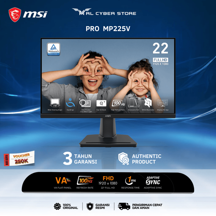 MSI PRO MP225V 100HZ MONITOR PC HDMI 1.4 x1 VGA x1 VESA 100x100mm EyesErgo Business Productivity GARANSI RESMI