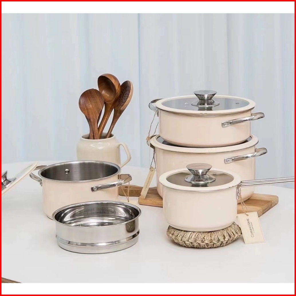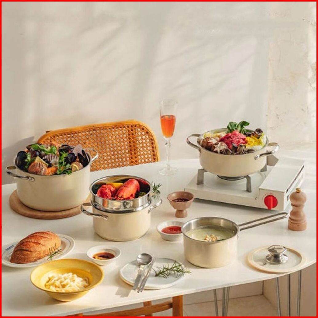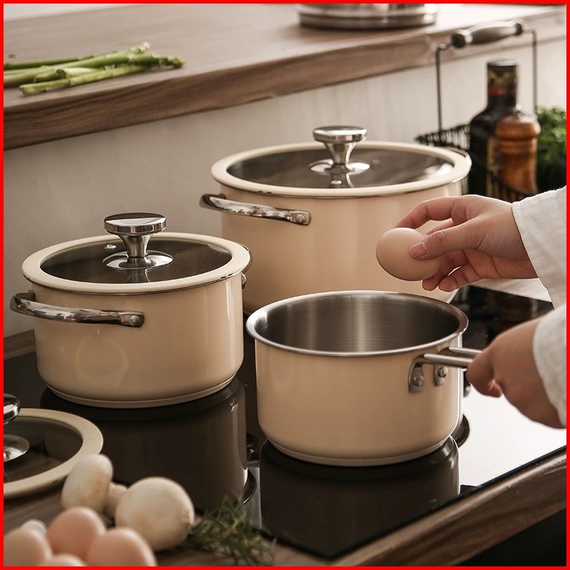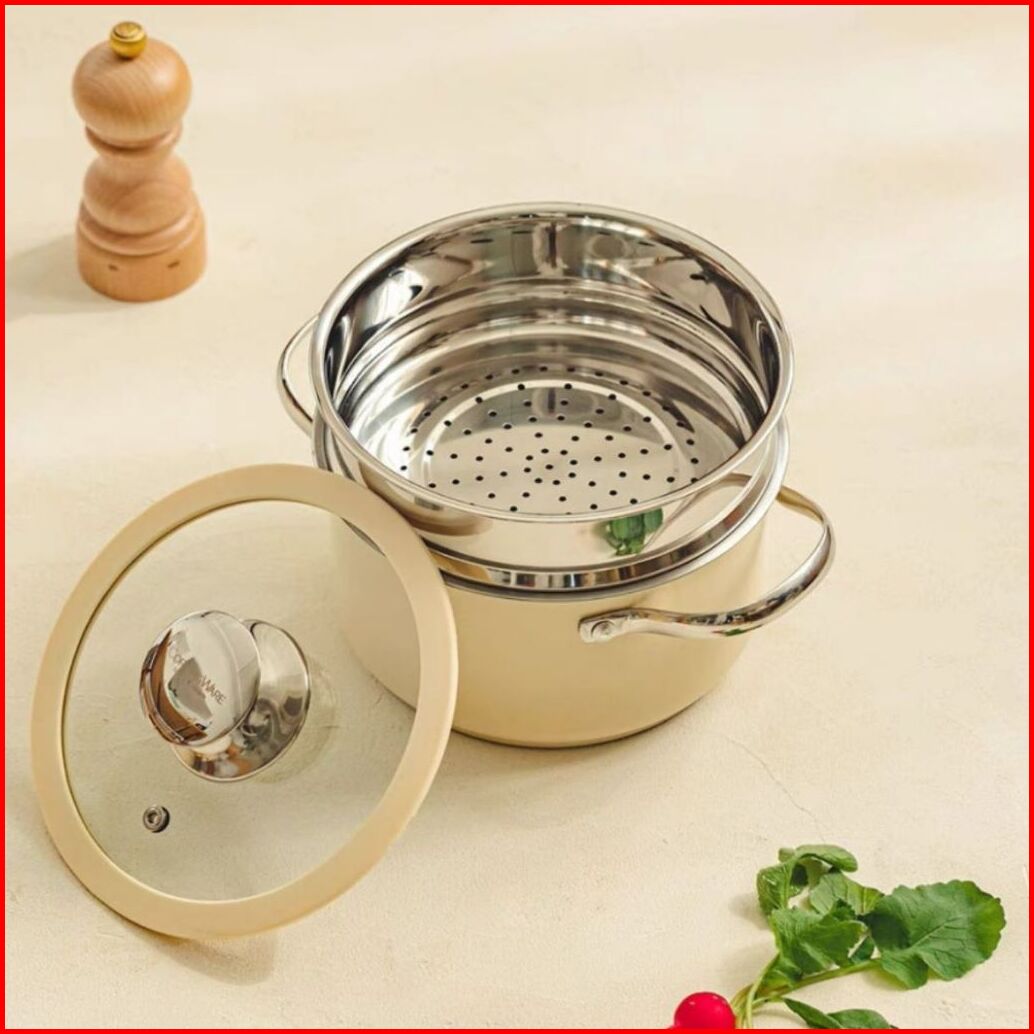 99khome Premium Saucepan Stockpot Cookware Set Steamer Stainless Steel Panci Kukus Anti Lengket Dengan Tutup Kaca Cream