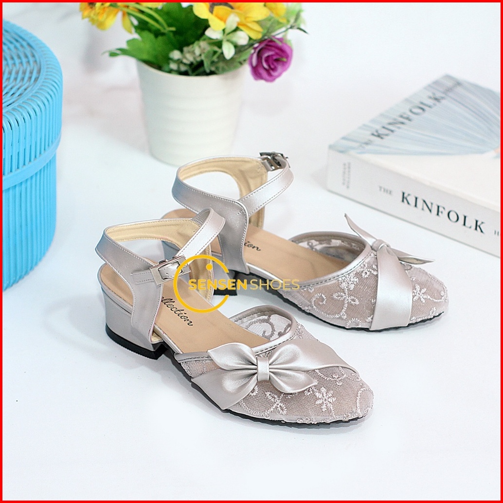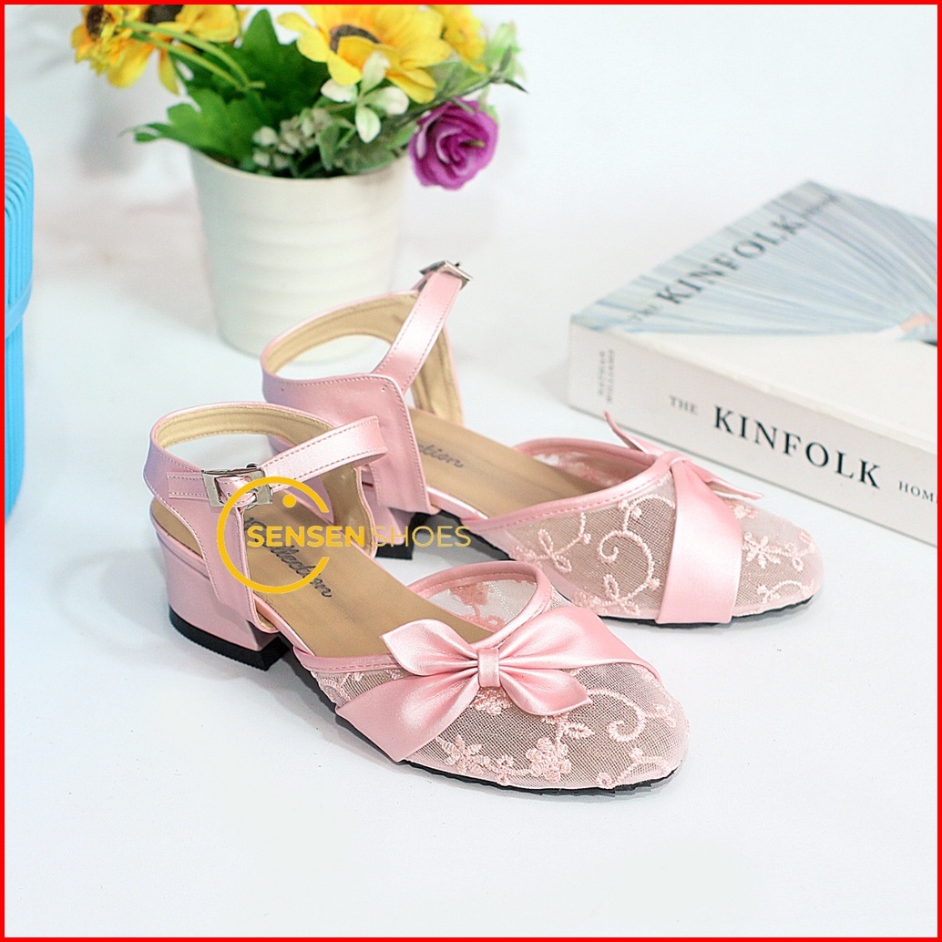 Sepatu Sandal Pesta Anak Perempuan Hak Tahu 3 Cm Brukat Jala Selop Motif Pita