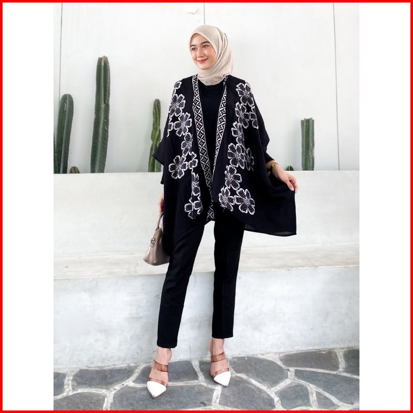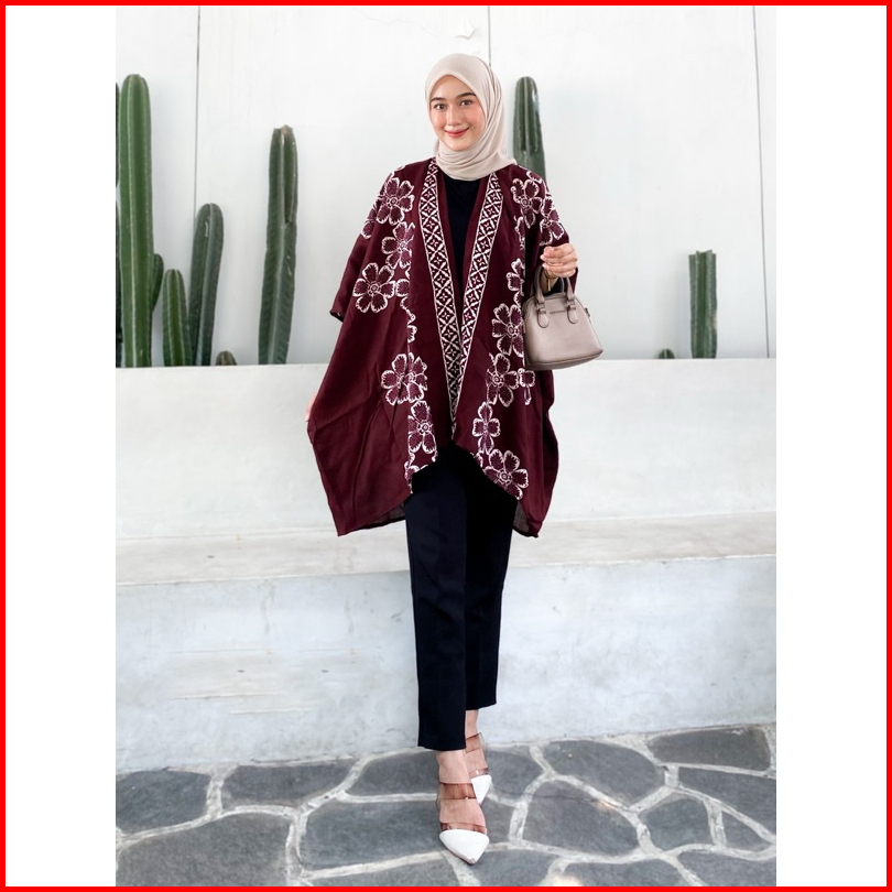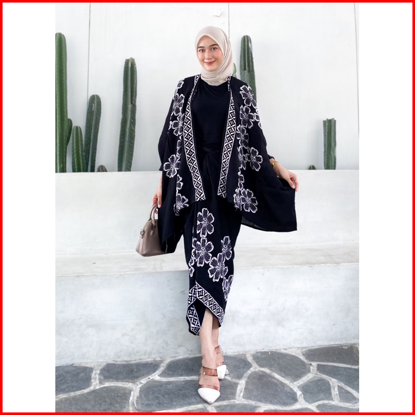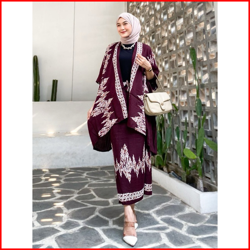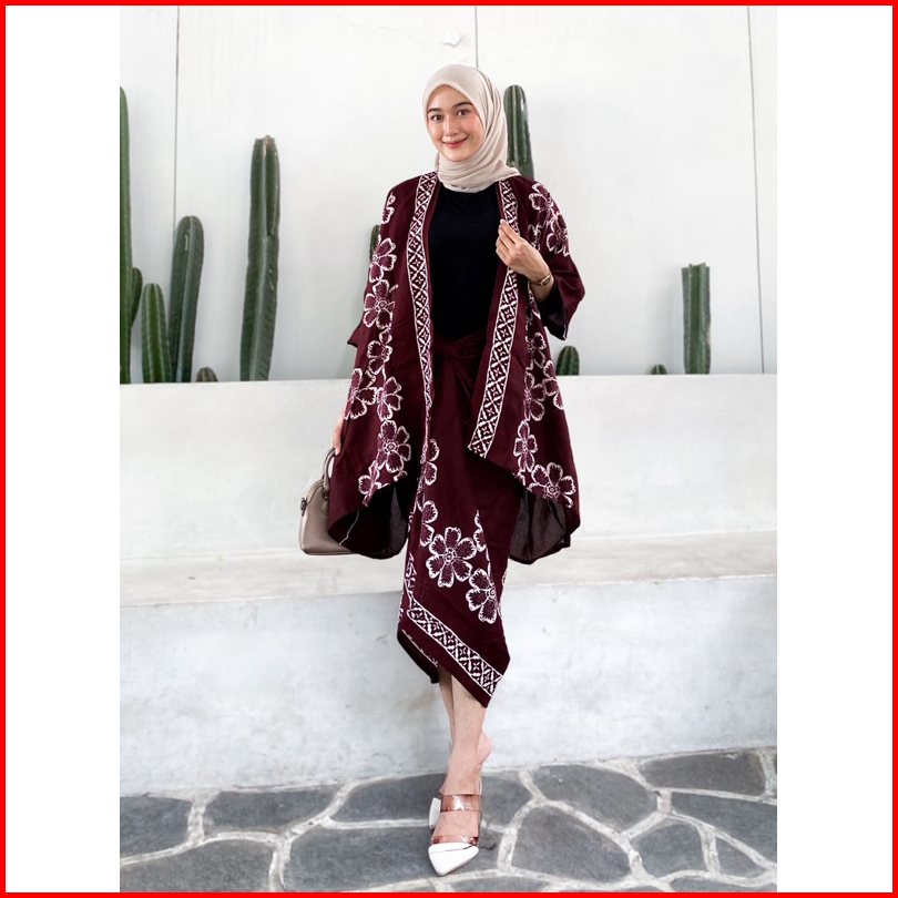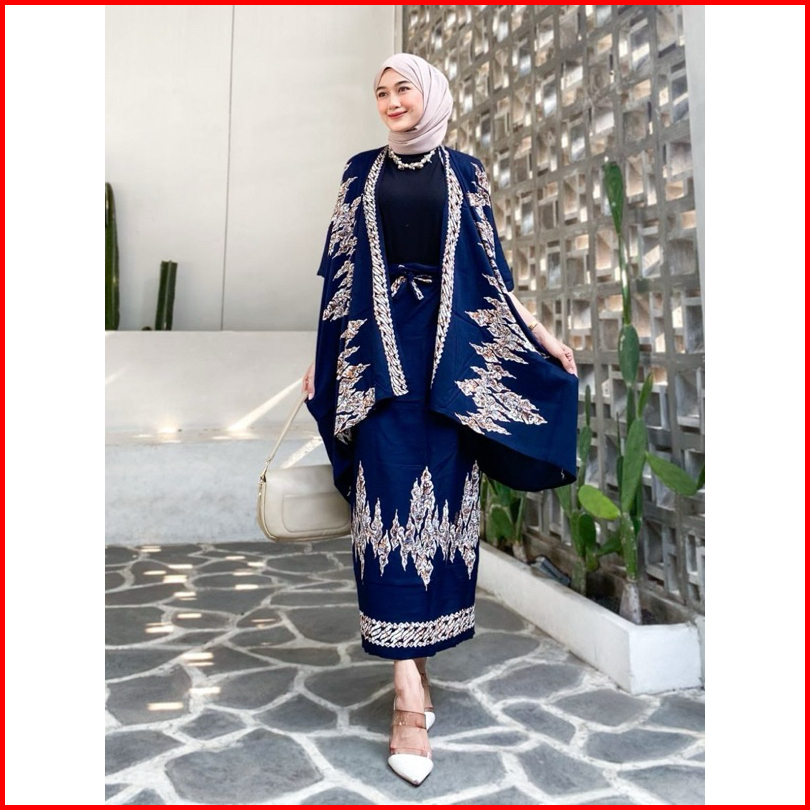 1set Tunik Kaftan Outfit Wanita Kondangan Simpel One Set Rok Lilit Motif Mega Mendung Kaftan Tunik Kekinian