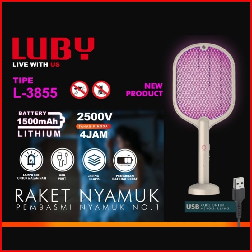 Luby L-3855 Raket Nyamuk Electric Led Violet Swatter Cas Ulang Tahan Lama