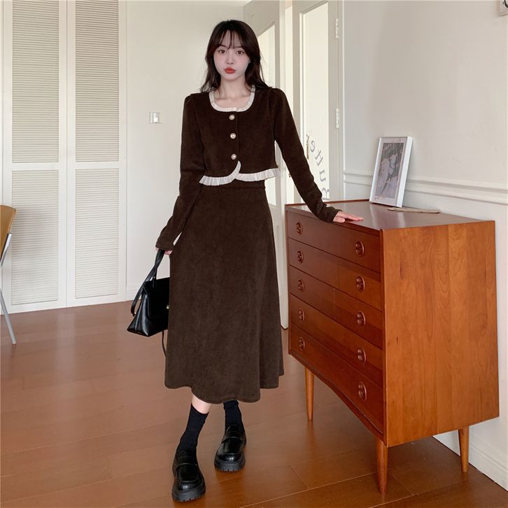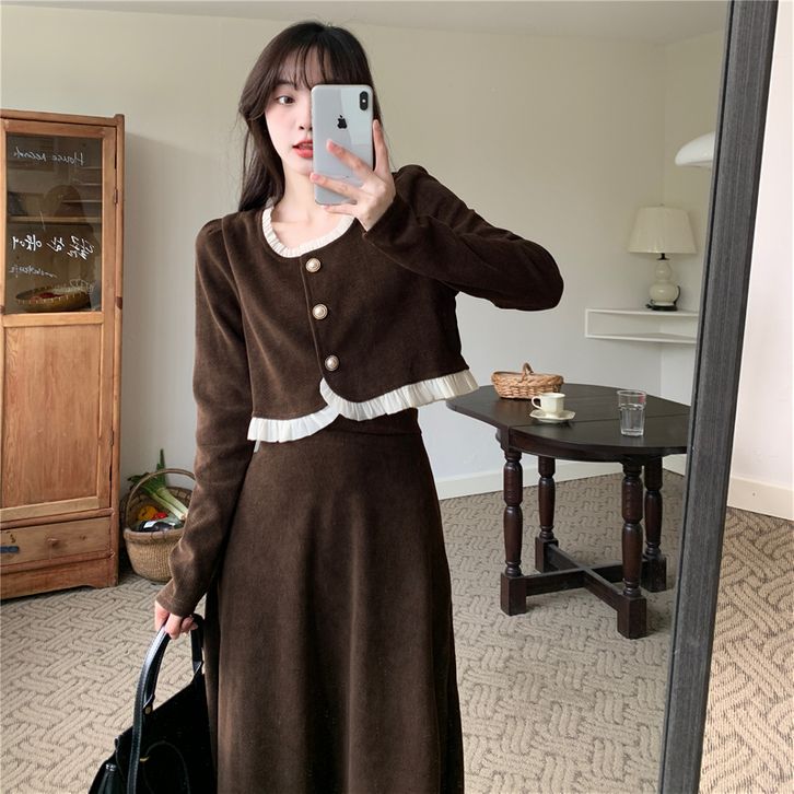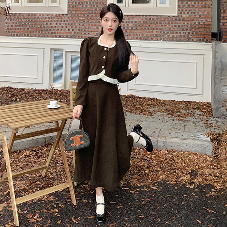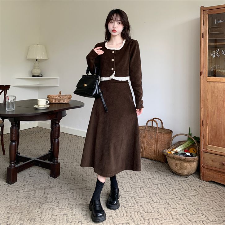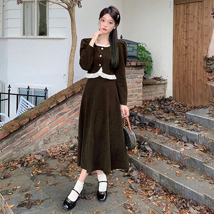 Setelan gaun musim gugur dengan kesan mewah Gaun leher persegi Prancis baru di musim gugur Gaun coklat Atasan korduroi