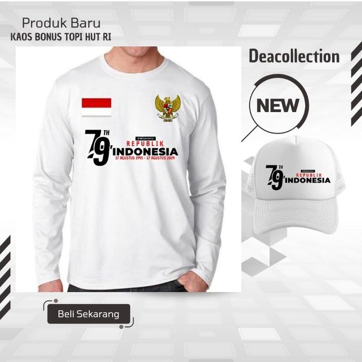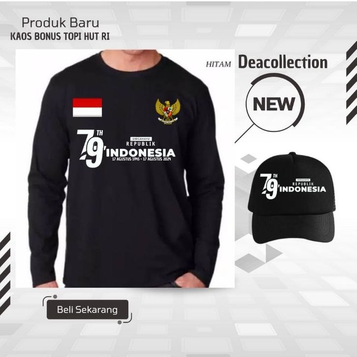 KAOS AGUSTUSAN KAOS DISTRO LENGAN PANJANG BONUS TOPI HUT RI KE 79 TAHUN INDONESIA MERDEKA KAOS HUT RI