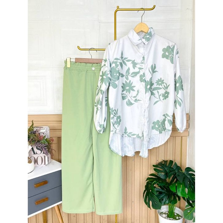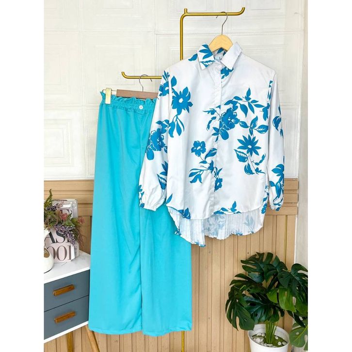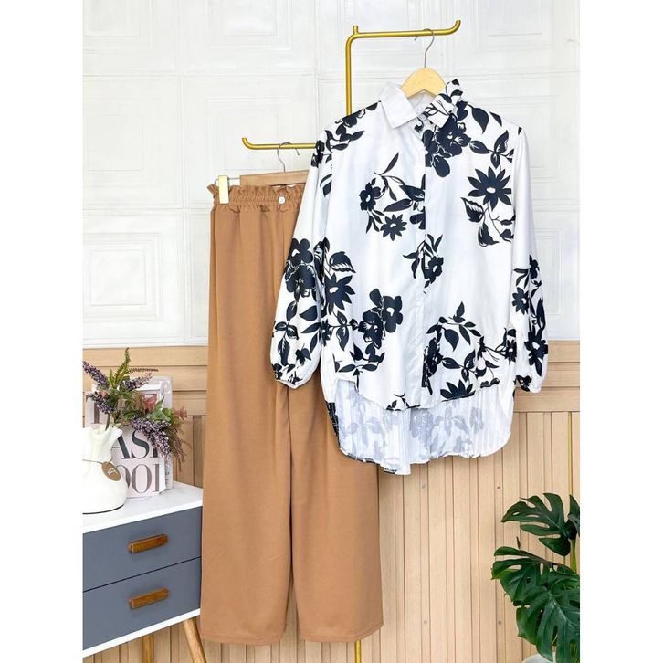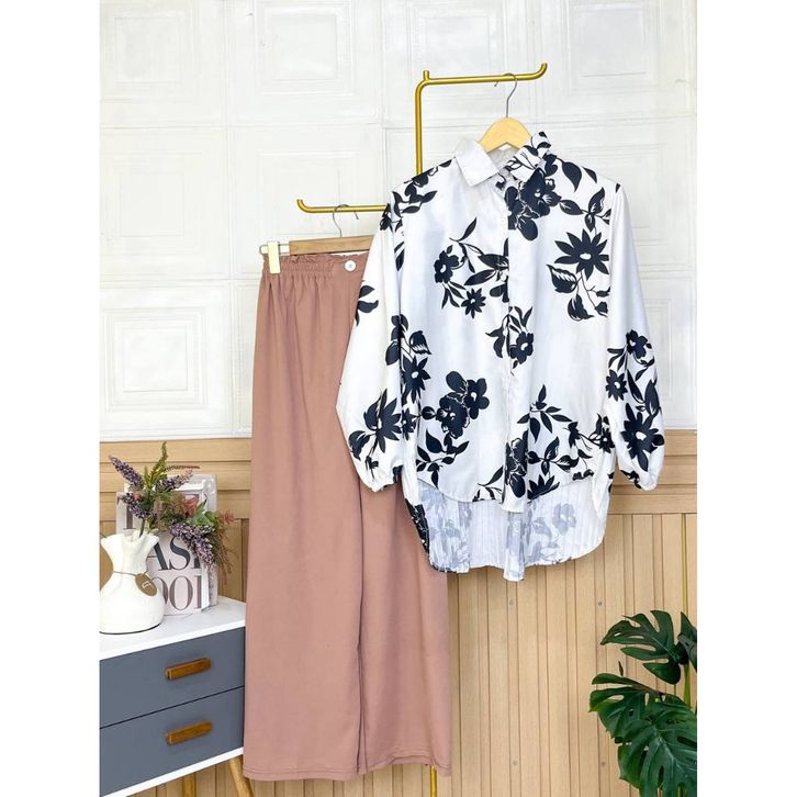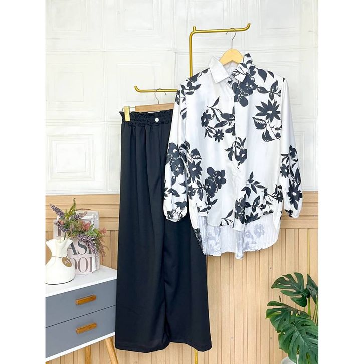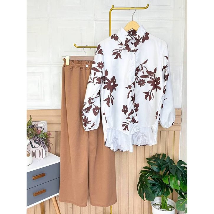 Setelan Wanita Dewasa One Set Kemeja Blouse Motif Celana Kulot Panjang Satu Set Kasual Formal Katun Premium