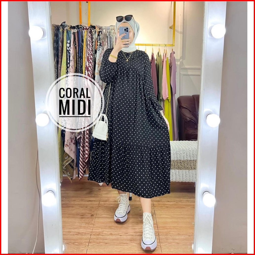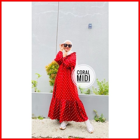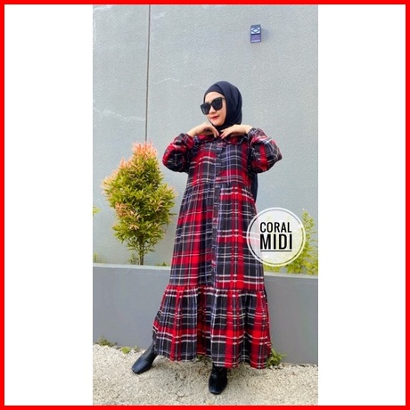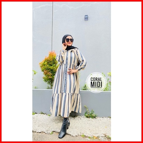 Coral Midi Dress Midi Homedress Rayon Stripe Kekinian Busui Baju Muslim Wanita
