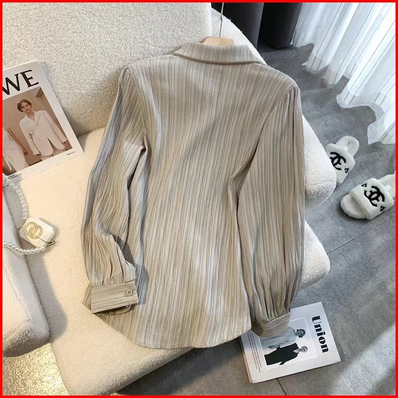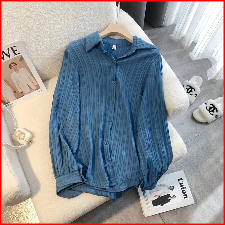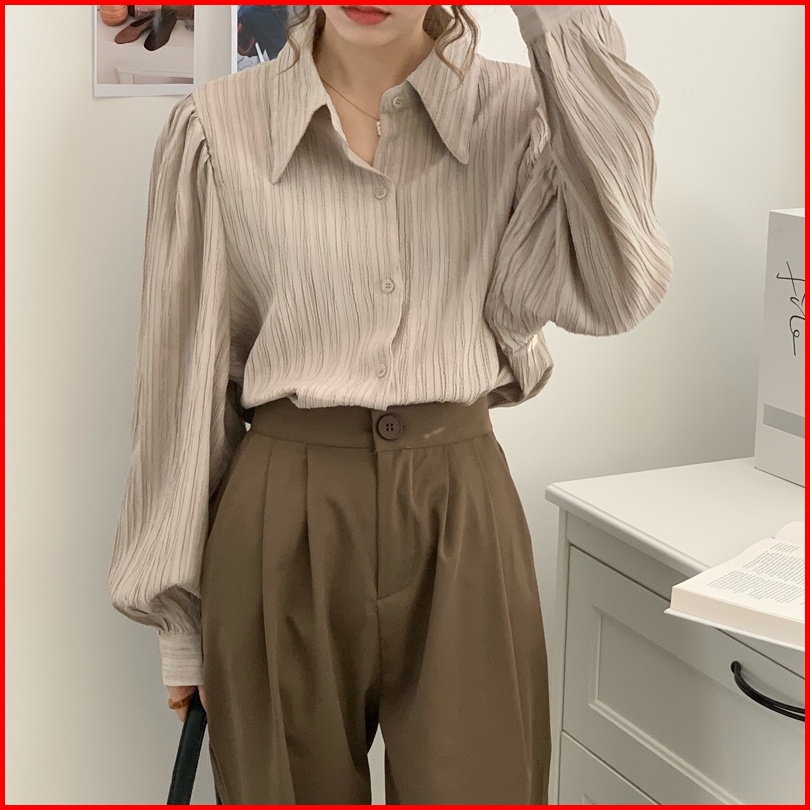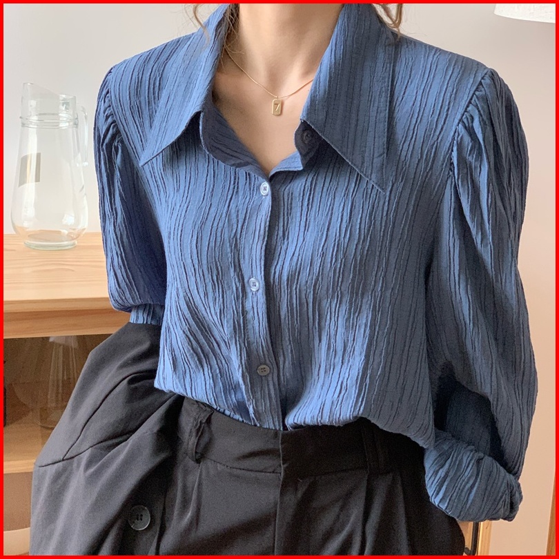 Chaoo.id Kemeja Wanita Style Crinkle Blouse Putih Baju Atasan Wanita Terbaru Katun Cron Kerah Polo Baju Atasan Wanita