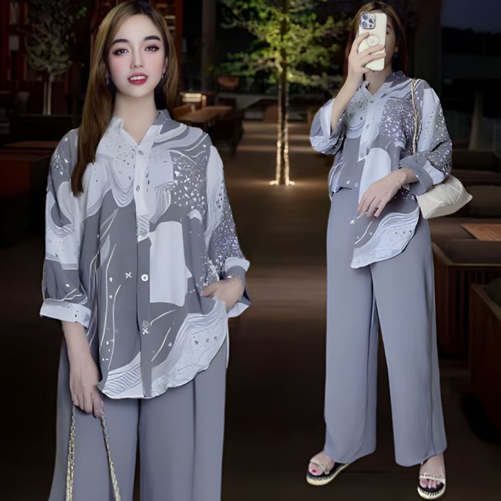 Setelan Crinkle Wanita One Set Perempuan Satu Set Celana Kulot Kemeja Voal Motif Lengan Panjang Fashion Kasual