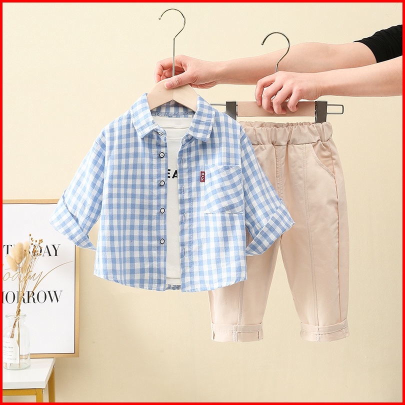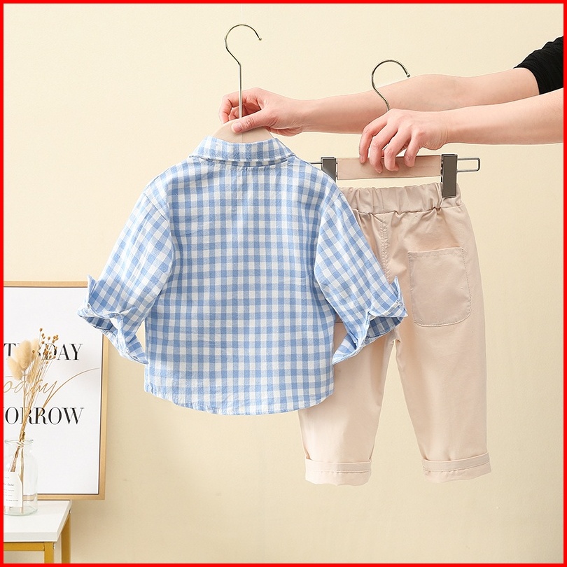 Setelan Kemeja Kotak Celana Panjang Fashion Import Anak Laki Laki Model Korea Impor Grosir