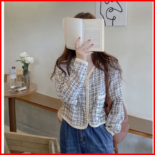 Jaket Wanita Korea Style Crop Lengan Panjang Import Kasual Retro V-neck Top