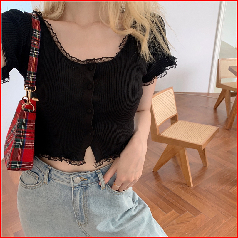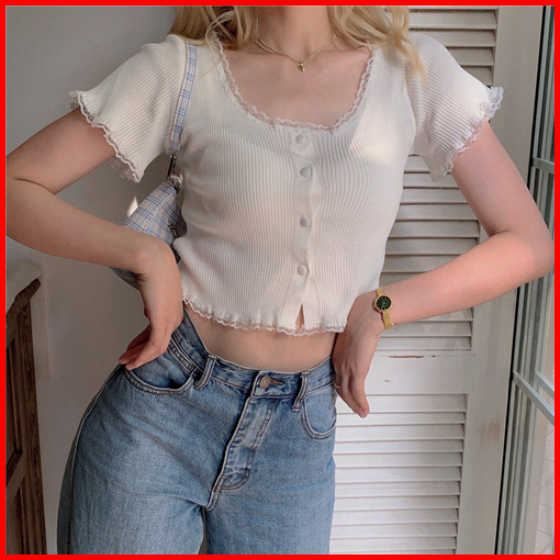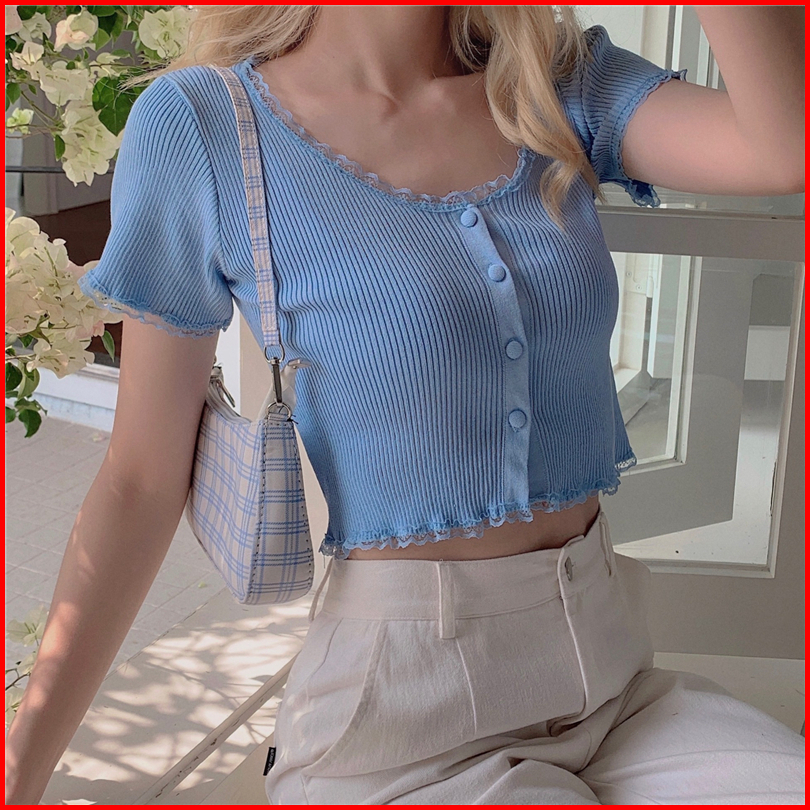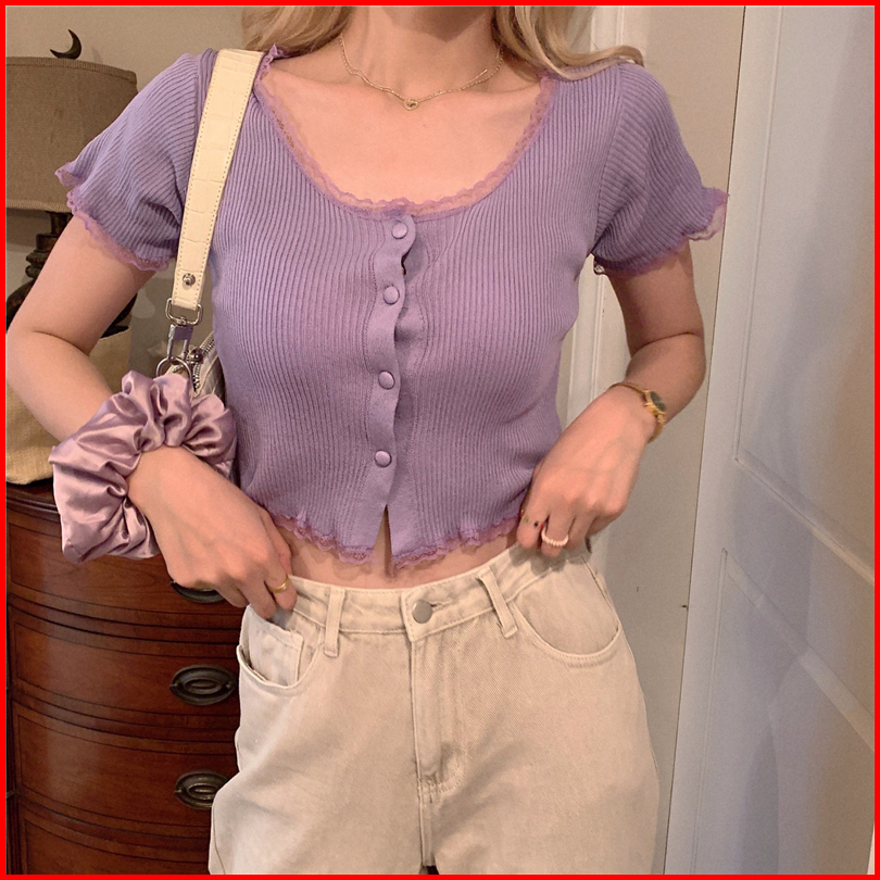 Crop Top Rajutan Renda Lengan Pendek Musim Panas