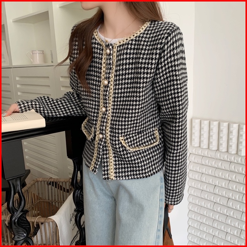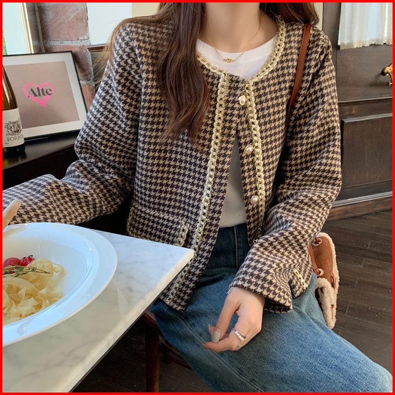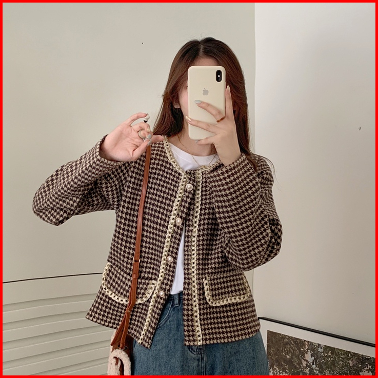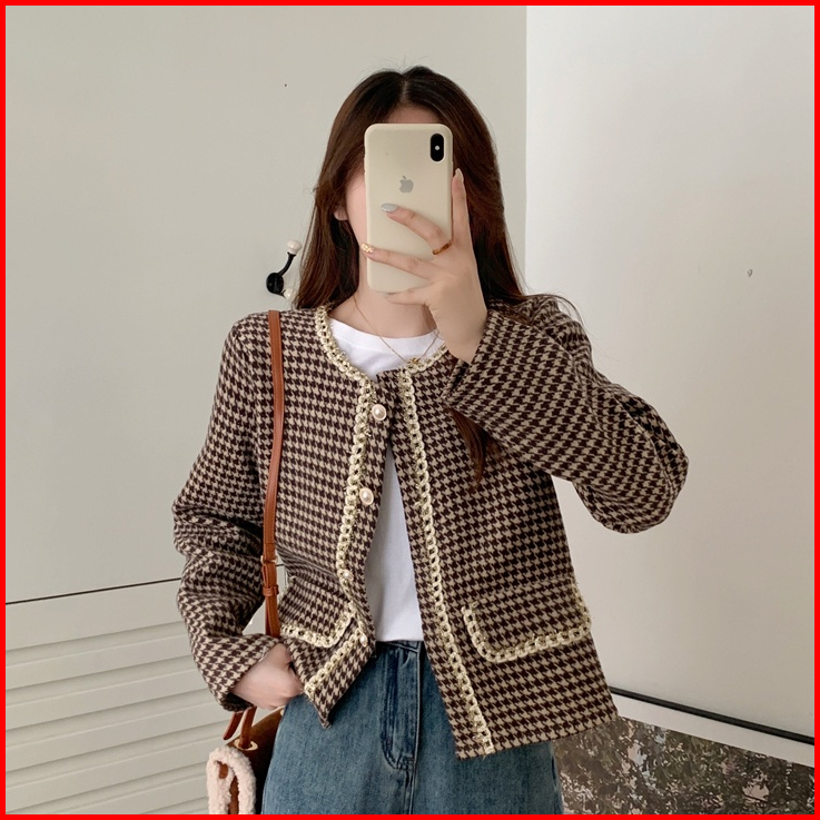 Jaket Wanita Terbaru Korean Style Lengan Panjang Kotak-kotak Kekinian Crop Cardigan Vintage Wanita