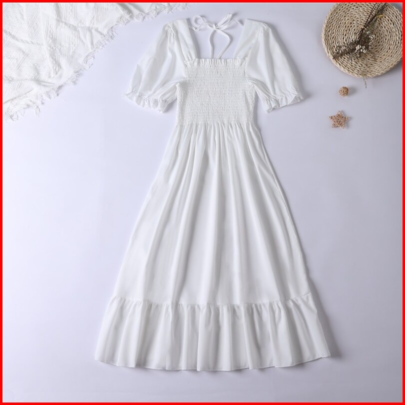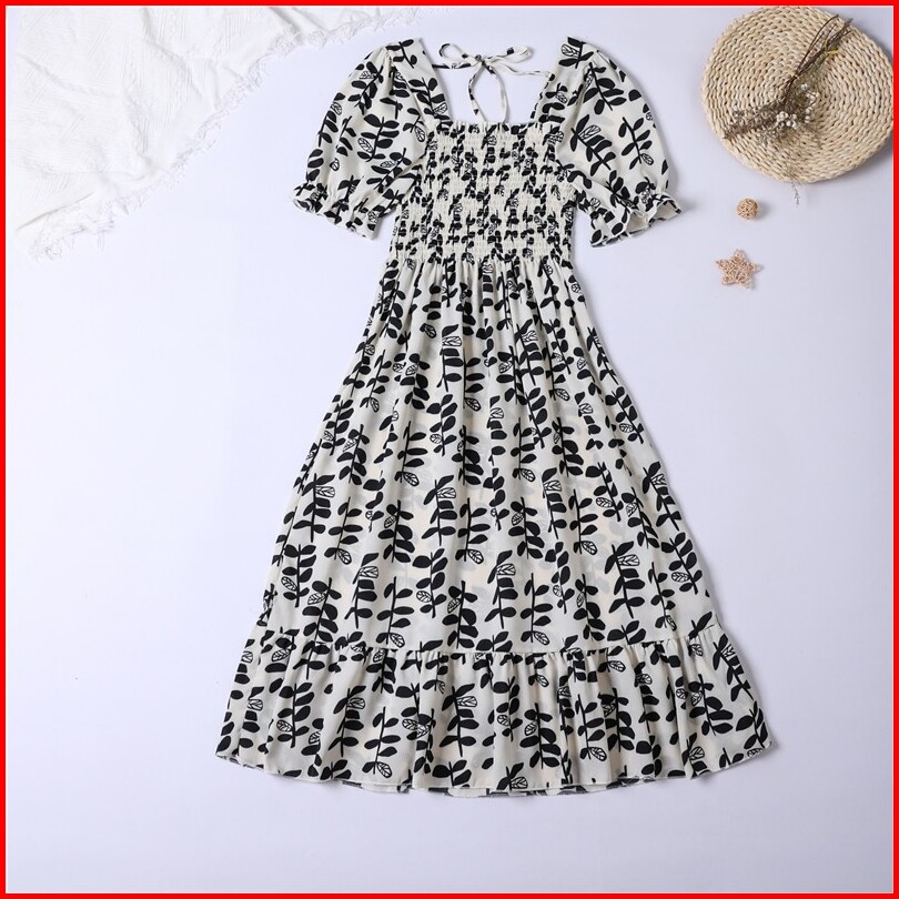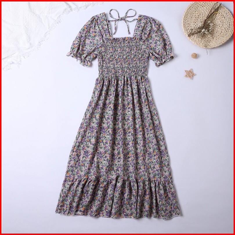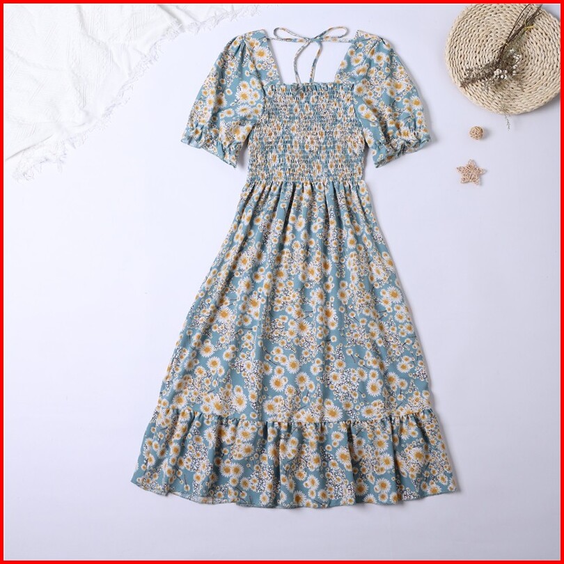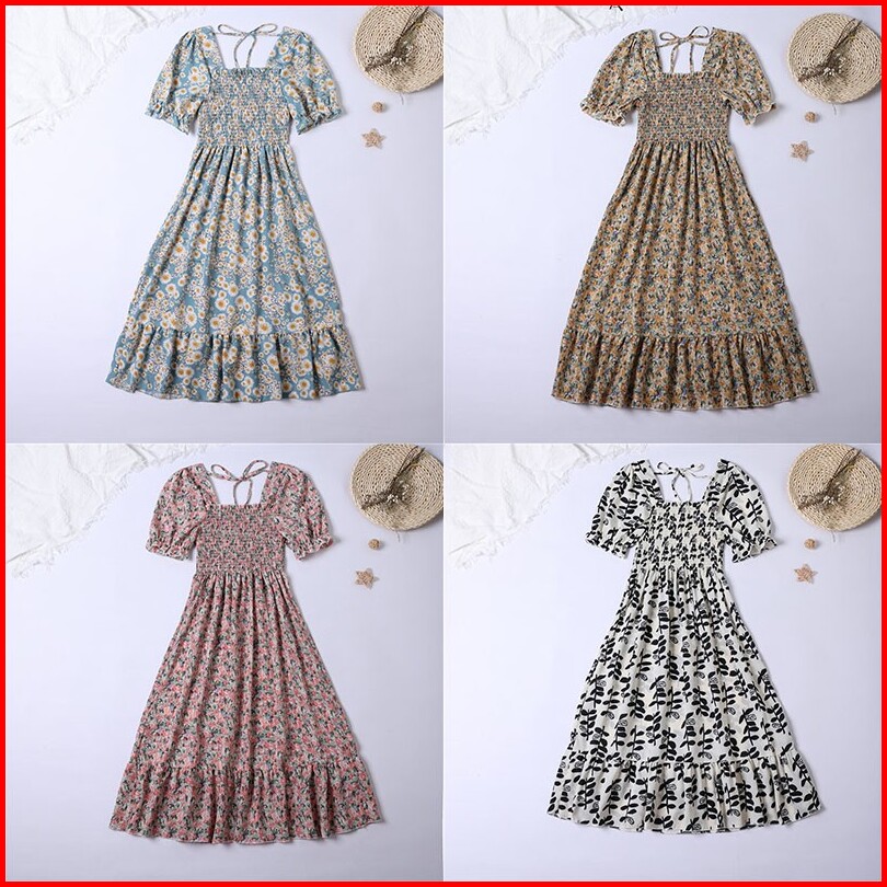 Dress Motif Bunga Smocked Korea Lengan Pendek Dengan Dasi Belakang